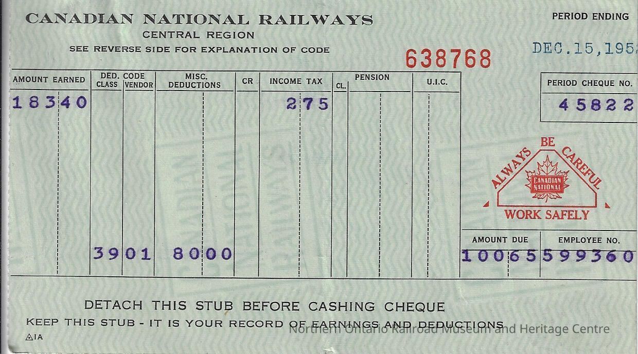 Canadian National branded statement of earnings and deductions belonging to Frank Mazzuca, for the pay period ending on December 15, 1952Creator