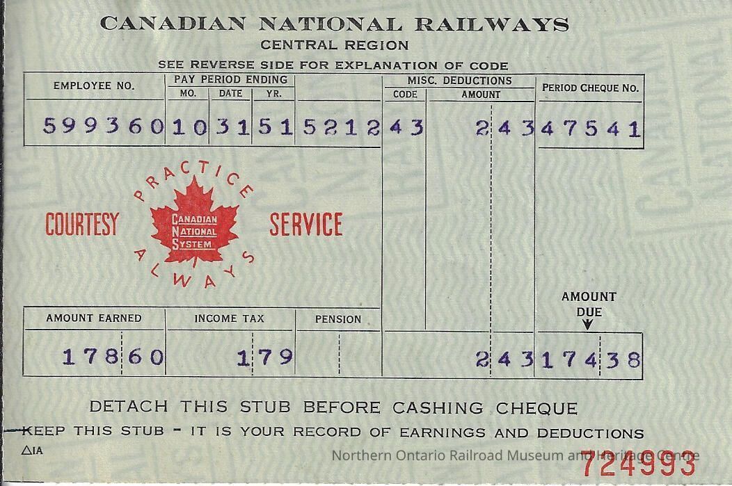 Canadian National Statement of Earnings and Deductions belonging to Frank MazzucaDescription