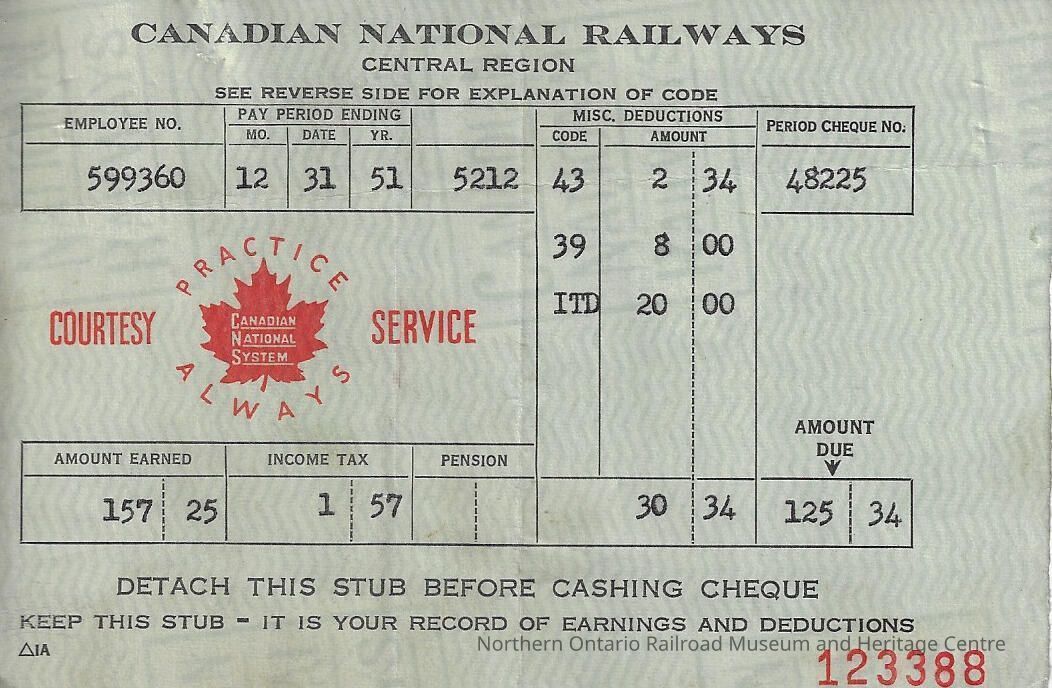 Canadian National branded statement of earnings and deductions belonging to Frank Mazzuca, for the pay period ending on December 31, 1951Creator