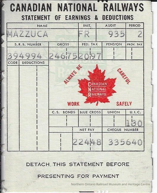Canadian National branded statement of earnings and deductions belonging to Frank MazzucaContext