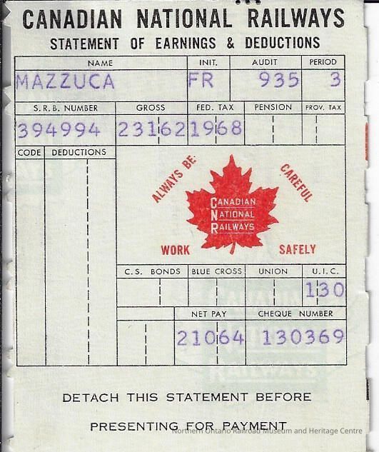 Canadian National branded statement of earnings and deductions belonging to Frank MazzucaContext