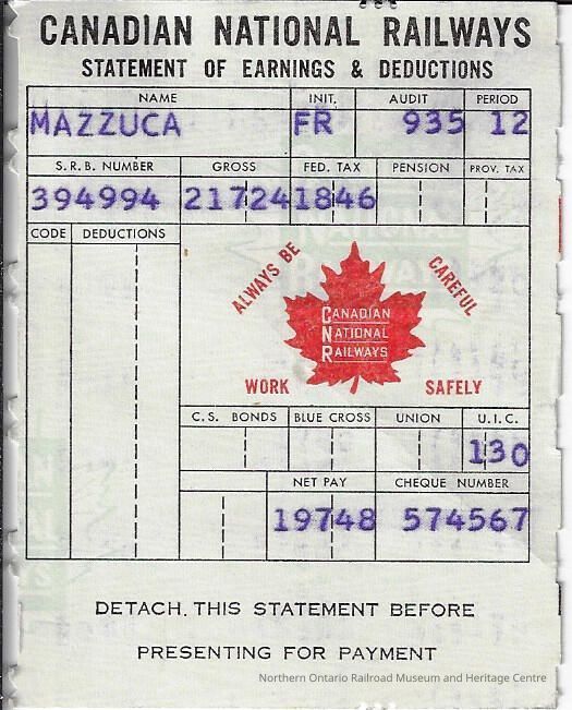 Canadian National branded statement of earnings and deductions belonging to Frank MazzucaContext