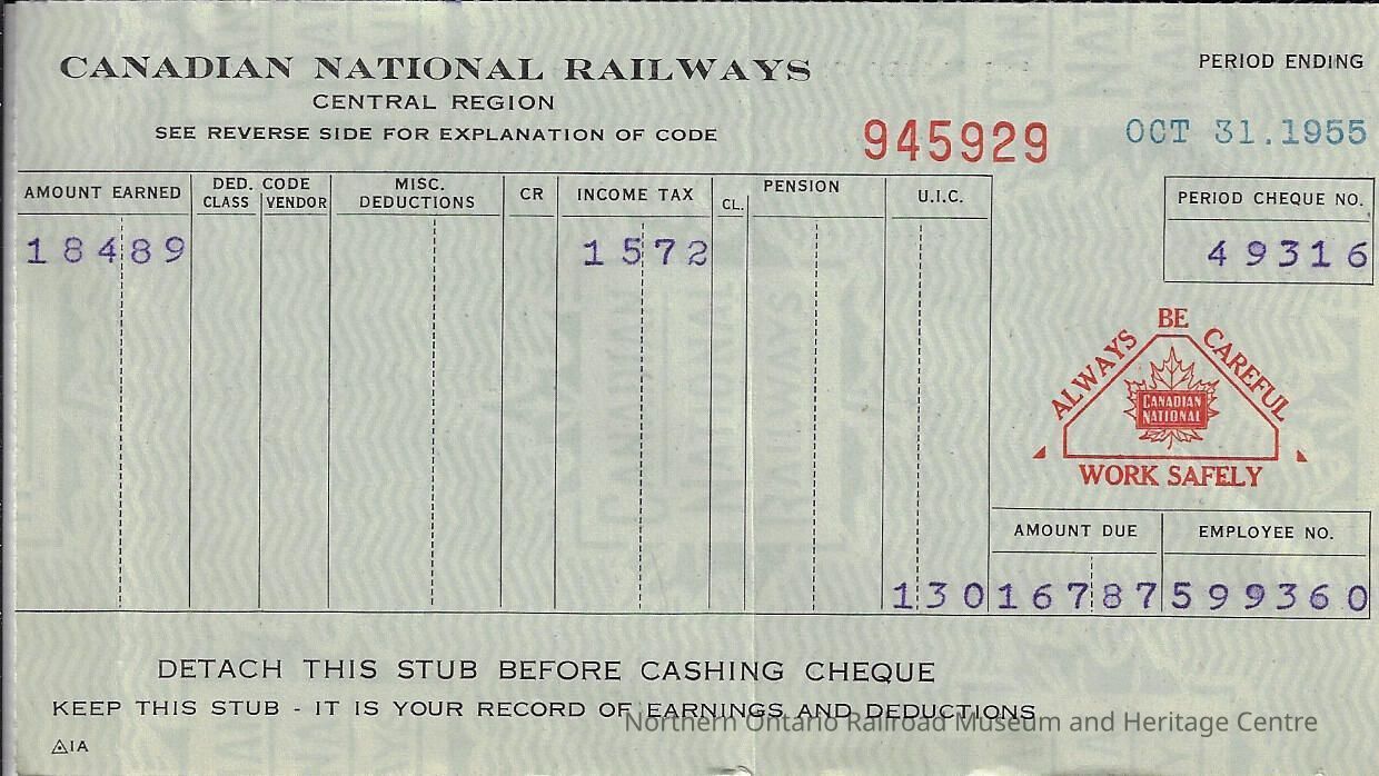 Canadian National branded statement of earnings and deductions belonging to Frank Mazzuca for the pay period ending on October 31, 1955Creator