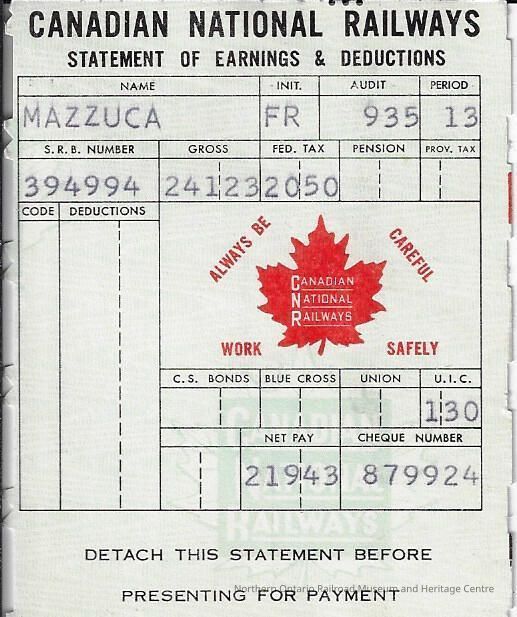 Canadian National branded statement of earnings and deductions belonging to Frank MazzucaContext