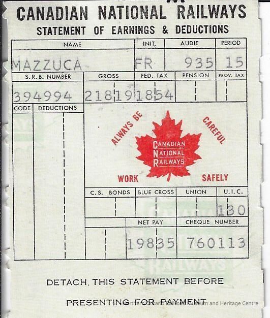 Canadian National branded statement of earnings and deductions belonging to Frank MazzucaCreator