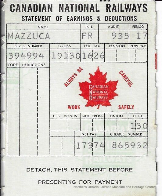 Canadian National branded statement of earnings and deductions belonging to Frank MazzucaContext