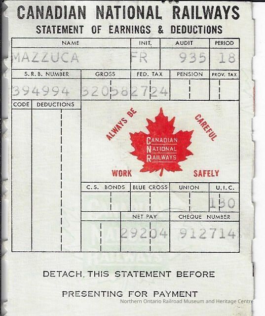 Canadian National branded statement of earnings and deductions belonging to Frank MazzucaContext