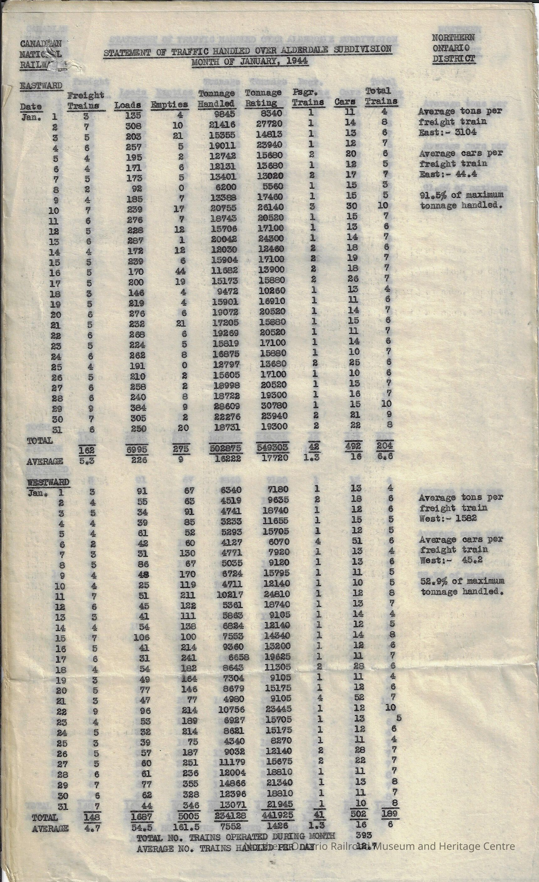 Report, statement of traffic handled over the Alderdale subdivision during the month of January in 1944. The report showcases the: date, freight trains, loads, empties, tonnage handled, tonnage rating, passenger trains, cars, and total trains that were handled in the subdivision in 1944. Seven pages total.
