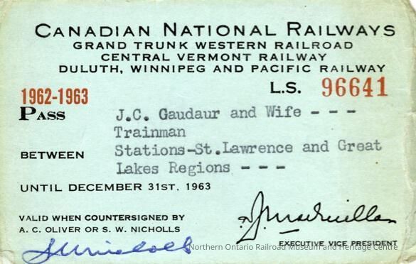 Canadian National: Stations in St. Lawrence and Great Lakes Regions Pass issued to J. C. Gaudaur and wife, 1962Entry/Object ID