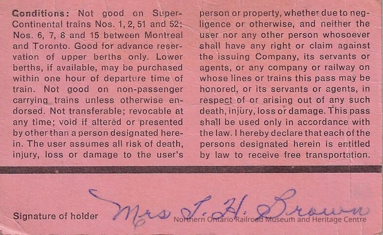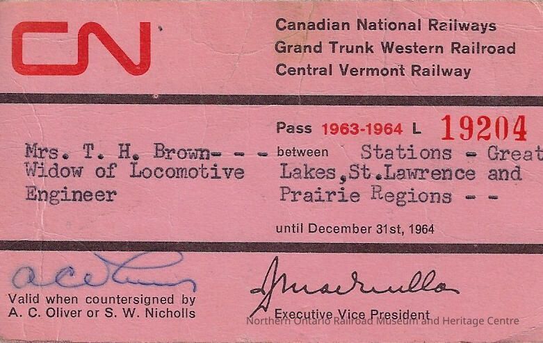 Canadian National branded stations in the Great Lakes, St. Lawrence, and Prairie Regions widow of employee pass issued to Mrs. T. H. (Edith) Brown. The pass was issued to her in 1963 and it allowed her to travel on any passenger train traveling between stations in the Great Lakes, St. Lawrence, and Prairie Regions. Her husband was Thomas (T. H.) Brown, a locomotive engineerContext