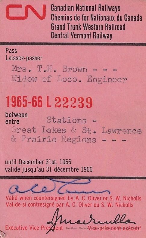 Canadian National branded stations in the Great Lakes, St. Lawrence, and Prairie Regions widow of employee pass issued to Mrs. T. H. (Edith) Brown. The pass was issued to her in 1965 and it allowed her to travel on any passenger train traveling between stations in the Great Lakes, St. Lawrence, and Prairie Regions. Her husband was Thomas (T. H.) Brown, a locomotive engineerContext