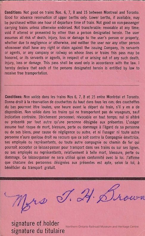 Canadian National: Stations in the Great Lakes, St. Lawrence, and Prairie Regions Widow of Locomotive Engineer Pass, Mrs. T. H. Brown, 1965Entry/Object ID
