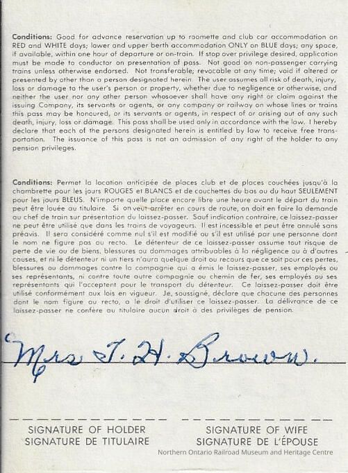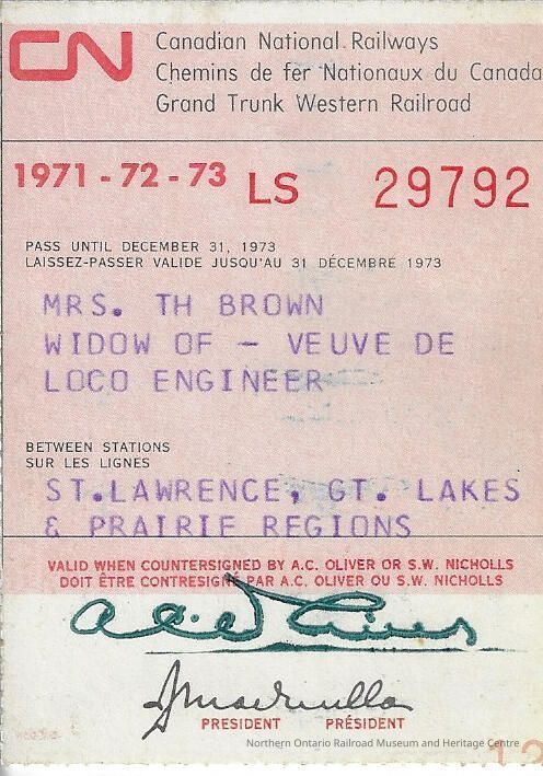 Canadian National: Stations in the Great Lakes, St. Lawrence, and Prairie Regions Widow of Locomotive Engineer Pass, Mrs. T. H. Brown, 1971Entry/Object ID