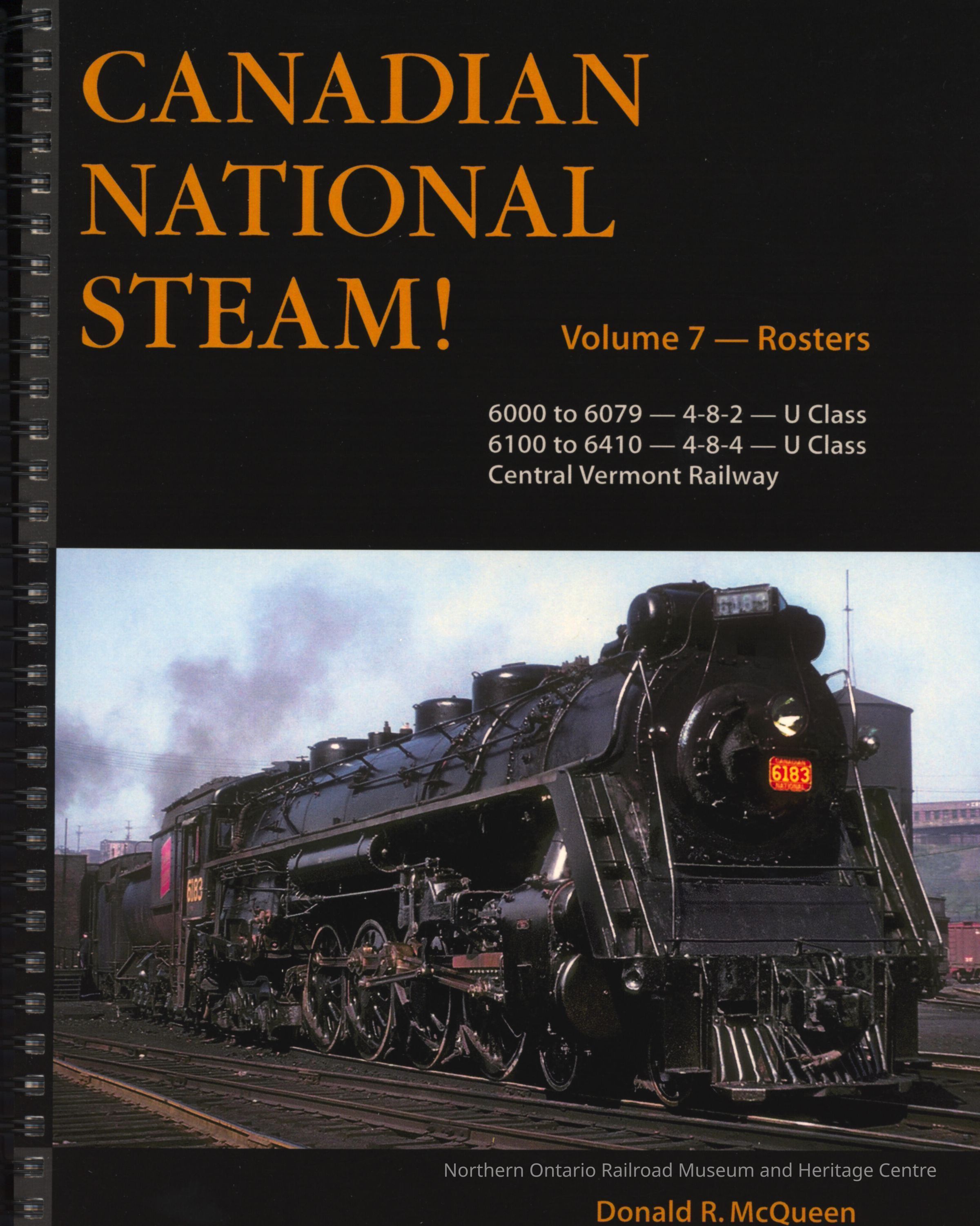 Book discussing the technological history of Canadian National Railways steam locomotives prior to 1960, specifically U Class. Includes: locomotive specifications, classes, and types for each steam locomotive. Volume 7 of the series. Focuses on the Central Vermont Railway.