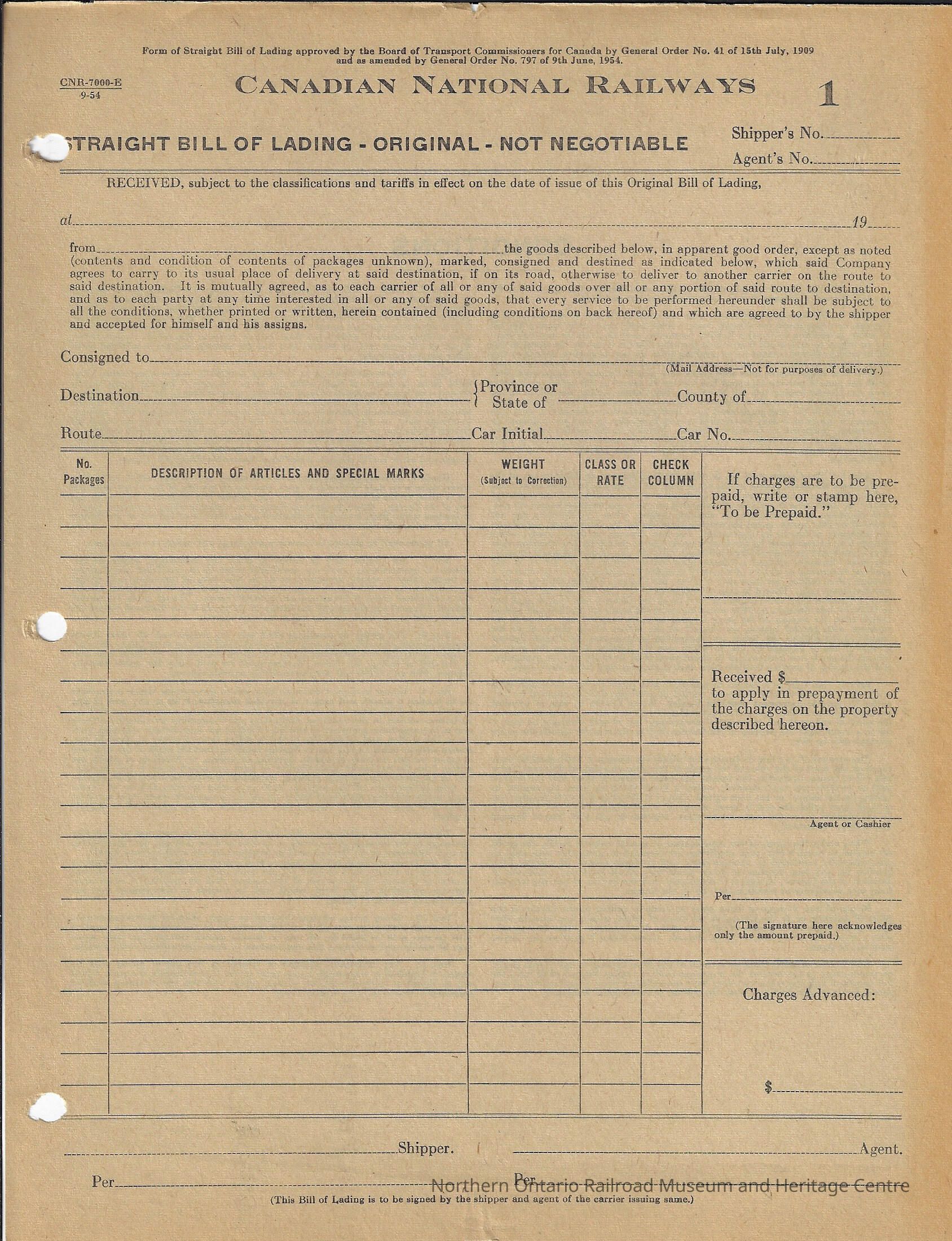 Form, straight bill of lading, original and non negotiable form. The front and reverse side of the form lists all of the terms and conditions associated with the bill of lading. The form itself is blank however it has the areas to record: shipper's number, agent's number, date, consigned to, destination, province, country, route, car initial, car number, number of packages, description of articles and special marks, weight, class or rate, check column, if charges were prepaid write "prepaid," amount received, signature of agent, charges advanced, signature of shipper, signature of agent.