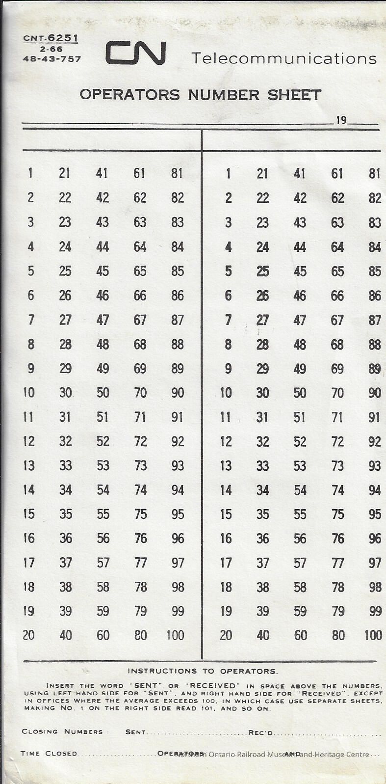 Canadian National Telecommunications: Operators Number SheetEntry/Object ID