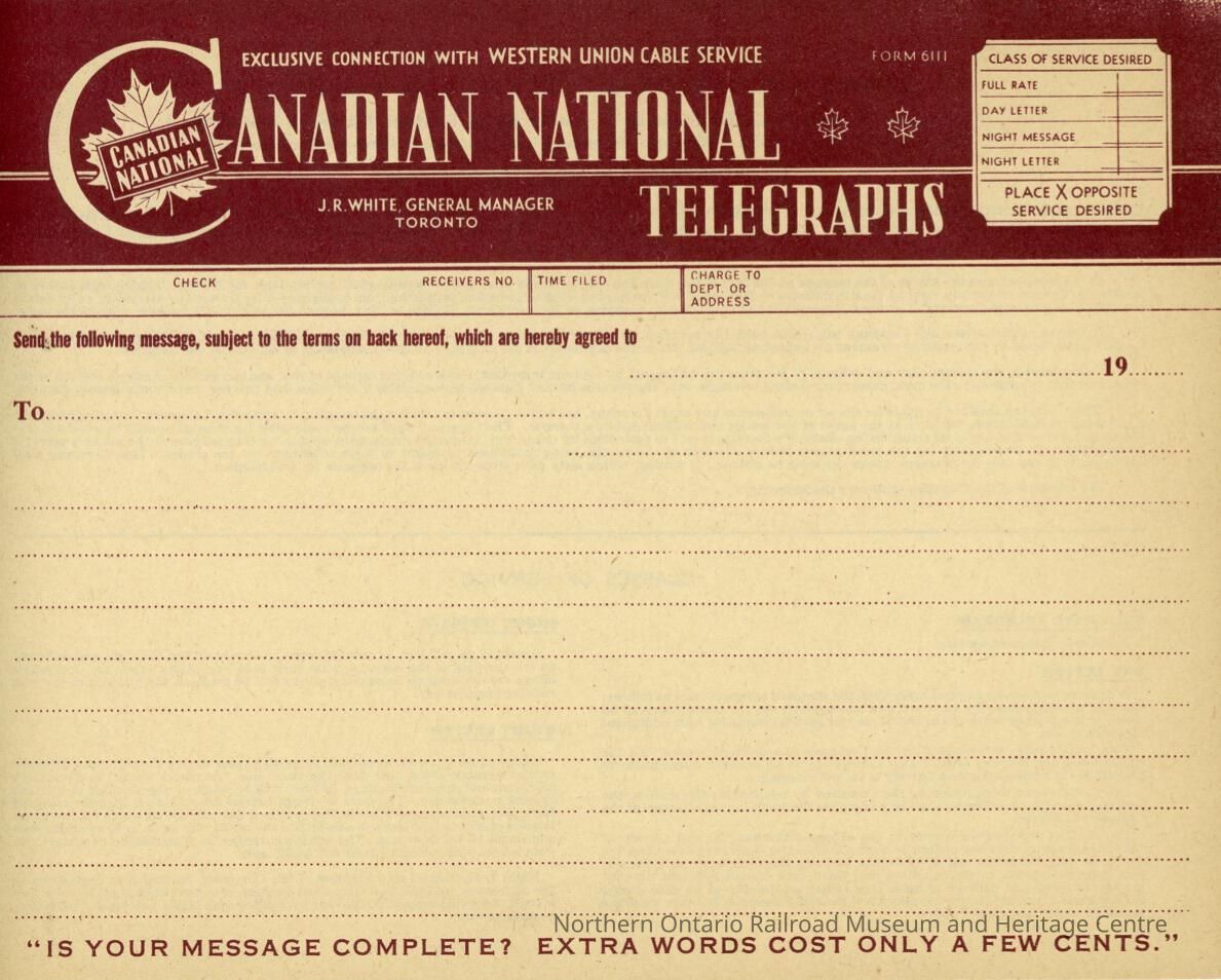 Blank Canadian National telegraph form, used for recording messages to be sent by telegraph.
