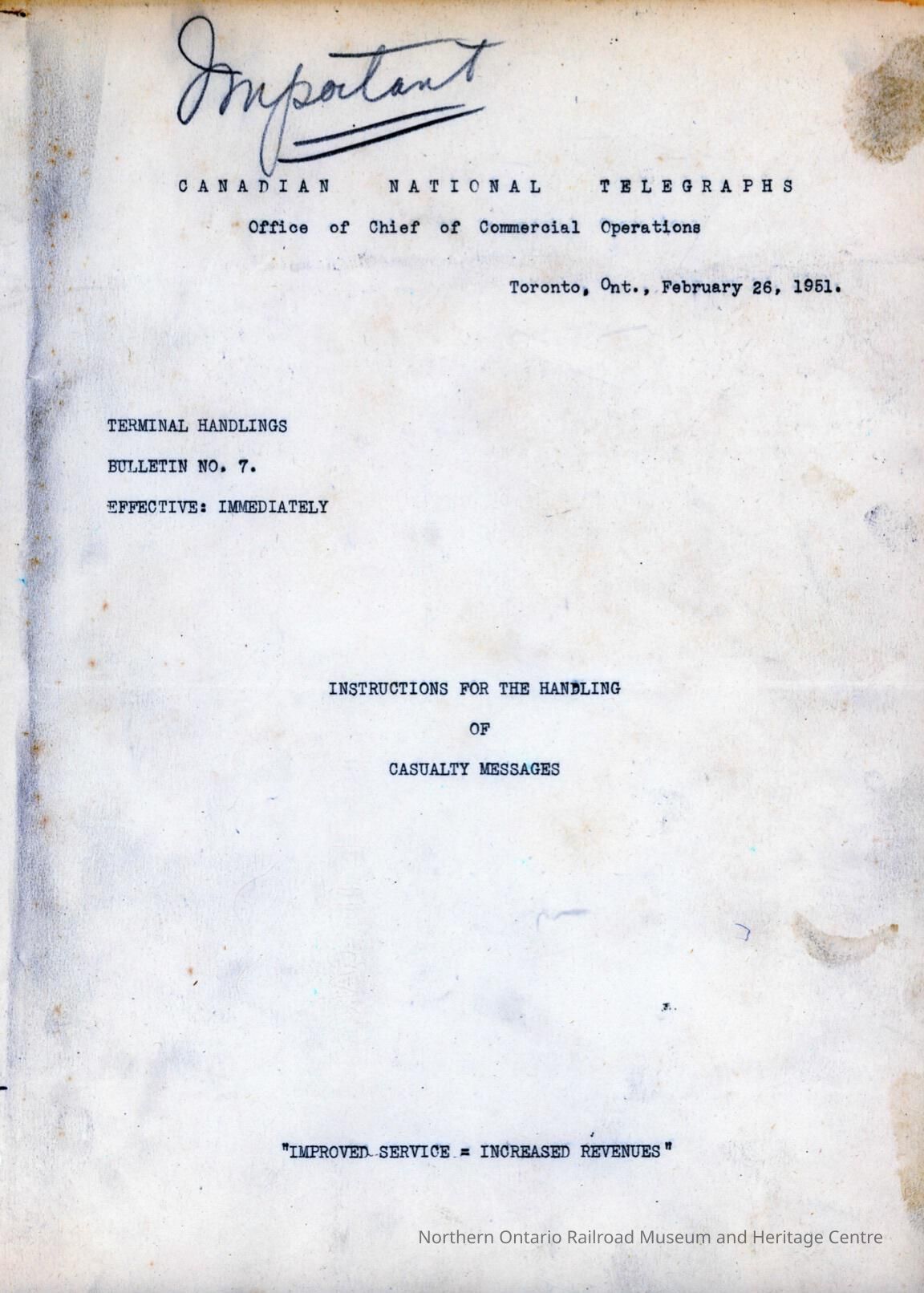 Canadian National Telegraphs, Office of Chief Commercial Operations, Toronto, Ontario, February 26, 1951, Terminal Handlings, Bulletin Number 7, Instructions for the Handling of Casualty Messages.Collection