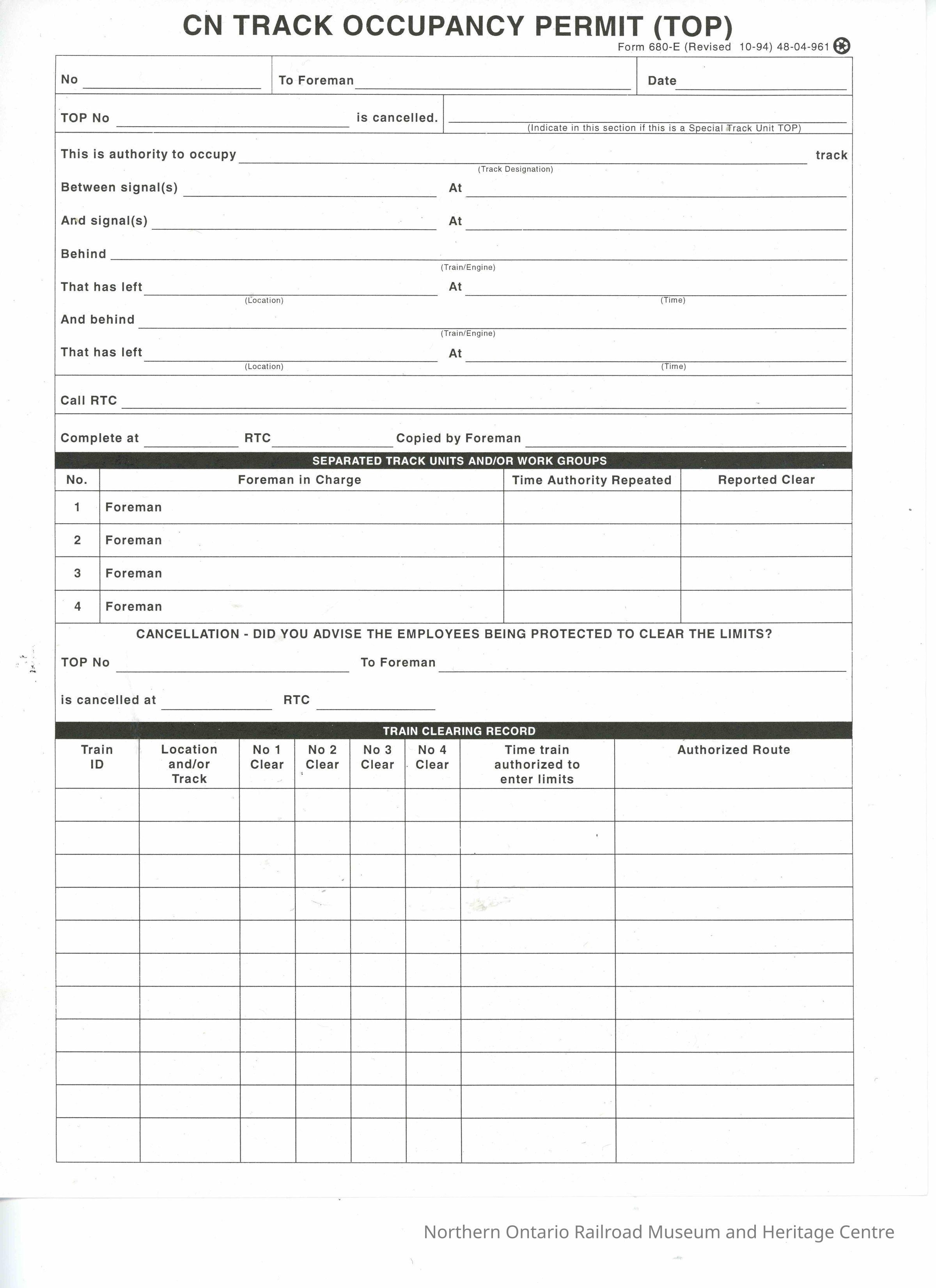 Form, Track Occupancy Permit used and published by Canadian National. The form itself is blank however it includes the areas to record: number, foreman, date, name of track occupied, between which signal(s), behind, time the train left, where it left from, which train it was behind, where that train left from, complete at, RTC, foreman's name, foremen in charge, time authority repeated, reported clear, TOP number, to foreman, is canceled at, RTC, train ID, location and or track, no 1 clear, no 2 clear, no 3 clear, no 4 clear, time train authorized to enter limits, authorized route.