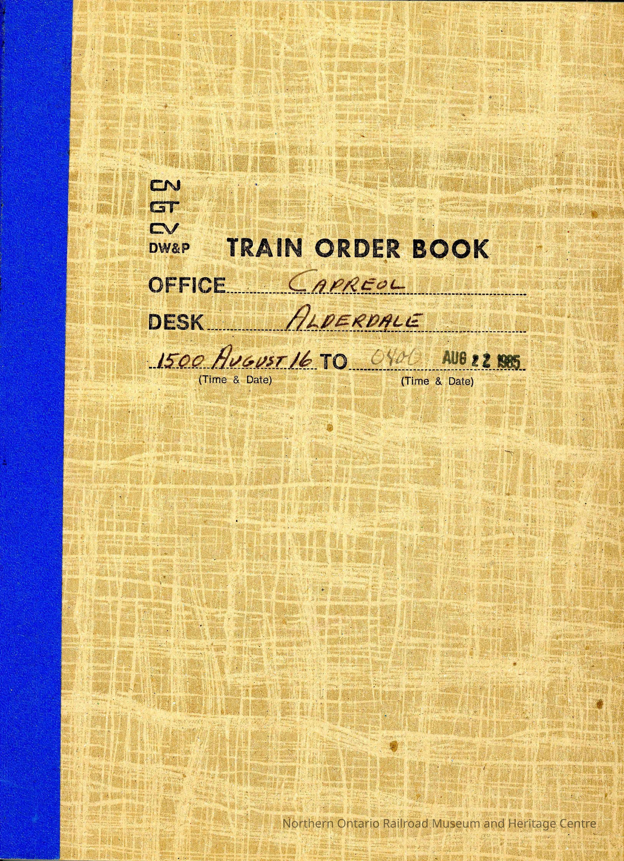 Train Order Book, CNR, GTW, CV. Office: Capreol, Desk: Alderdale, 1500 August 16 to 0400 August 22nd 1985. On cover.Other Names and Numbers