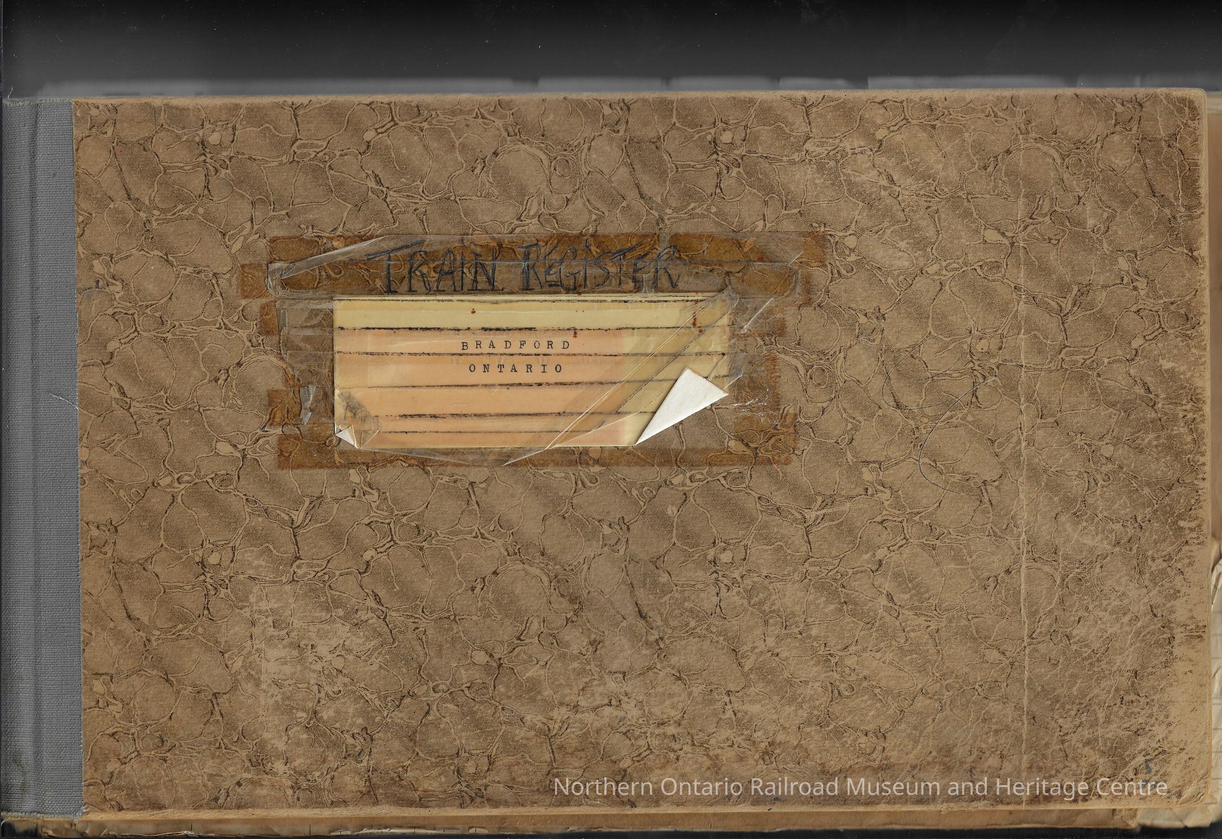 Book, train register log for all trains going in or out of Bradford Ontario from 1982 until 1986. It includes the following for each train: train number, unit number, signals displayed, engineman, trainman, time of arrival, time off duty, cars arriving, passenger, freight, loads, empties including cab, tons, time ordered, time watch compared with standard clock, variation from standard time, seconds fast or slow, leaving time, cars leaving, passenger, freight, loads, empties including cabs, tons, signature of conductor, journal number and remarks.