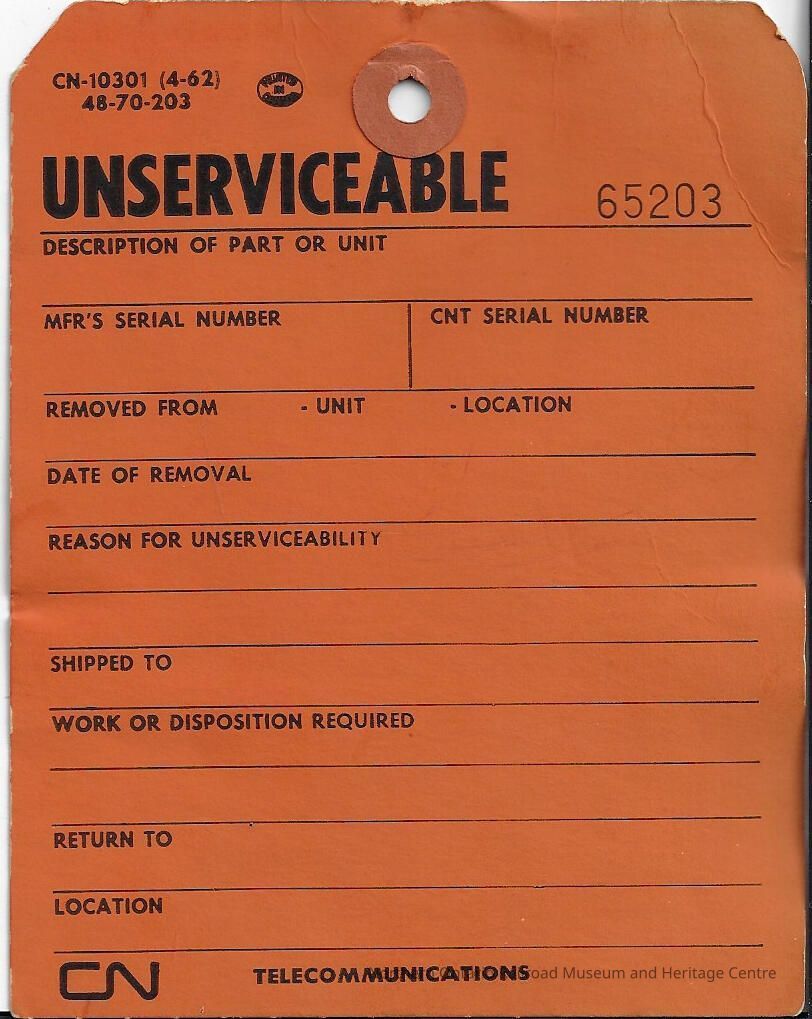 Tag used to mark units or parts as unserviceable. The tag is blank but it includes the sections to record: description of part or unit, MFR's serial number, CNT serial number, removed from, unit, location, date of removal, reason for unserviceability, shipped to, worked on or disposition required, return to, location