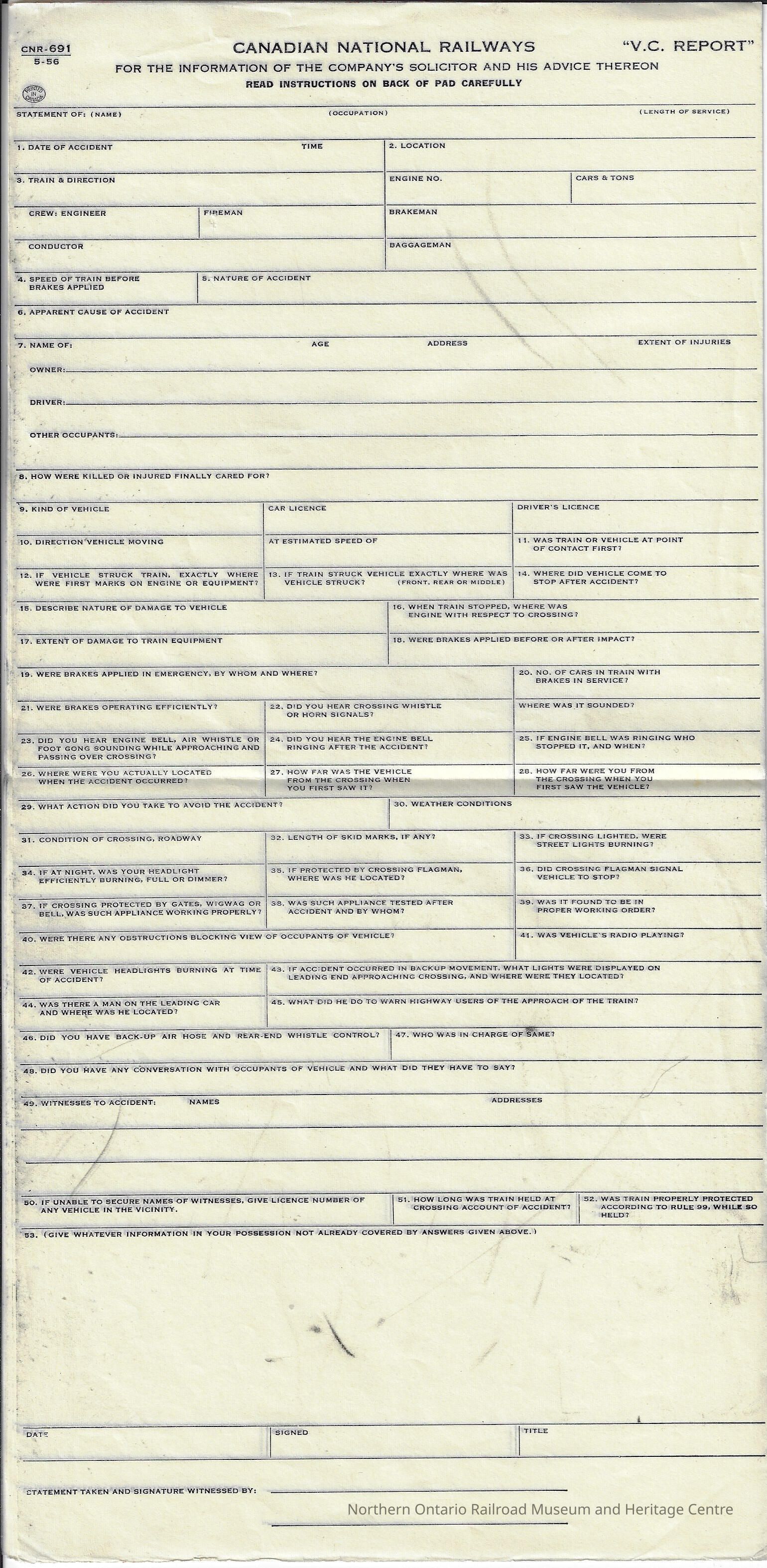 Form, Vehicle Collision report form used and published by Canadian National to record collisions. The form itself is meant to be given to the company's solicitor after a collision. It is blank however it has the areas to record: statement of name, occupation, length of service, date of accident, time, location, train and direction, engine number, cars and tons, crew engineer, fireman, brakeman, conductor, baggageman, speed of train before brakes applied, nature of accident, apparent cause of accident, name of, age, address, extent of injuries, owner, driver, other occupants, how were killed or injured finally cared for, kind of vehicle, car license, driver's license, direction vehicle was moving, estimated speed of, was train or vehicle at point of contact first, if vehicle struck train exactly where were first marks on engine or equipment, if train struck vehicle exactly where was vehicle struck, where did vehicle come to stop after accident, describe nature of damage to vehicle, when train stopped where was engine with respect to crossing, extent of damage to train equipment, were brakes applied before or after impact, were brakes applied in emergency by whom and where, no of cars in train with breaks in service, were brakes operating efficiently, did you hear crossing whistle or horn signals, where was it sounded, did you hear engine bell air whistle or foot gong sounding while approaching and passing over crossing, did you hear the engine bell ringing after accident, if engine bell was ringing who stopped it and when, where were you actually located when the accident occurred, how far was the vehicle from the crossing when you first saw it, how far were you from the crossing when you first saw the vehicle, what actions did you take to avoid the accident, weather conditions, condition of crossing and roadway, length of skid marks if any, if crossing lighted were street lights burning, if at night was your headlight efficiently burning full or dimmer, if protected by crossing flagman where was he located, did crossing flagman signal vehicle to stop, if crossing protected by gates wigwag or bell was such appliance working properly, was such appliance tested after accident and by whom, was it found to be in proper working order, were there any obstructions blocking view of occupants of vehicle, was vehicle's radio playing, were vehicle's headlights burning at the time of accident, if accident occurred in backup movement what lights were displayed on leading end approaching crossing and where were they located, was there a man on the leading car and where was he located, what did he do to warn highway users of the approach of the train, did you have any backup air hose and rear end whistle control, who was in charge of the same, did you have any conversation with occupants of vehicle and what did they have to say, witnesses to the accident, names, addresses, if unable to secure names of witnesses give license number of any vehicle in vicinity, how long was train held at crossing account of accident, was train properly protected according to rule 99 while so held, give whatever information in your possession not already covered by answers given above, date, signature, title, statement taken and signature witnessed by.