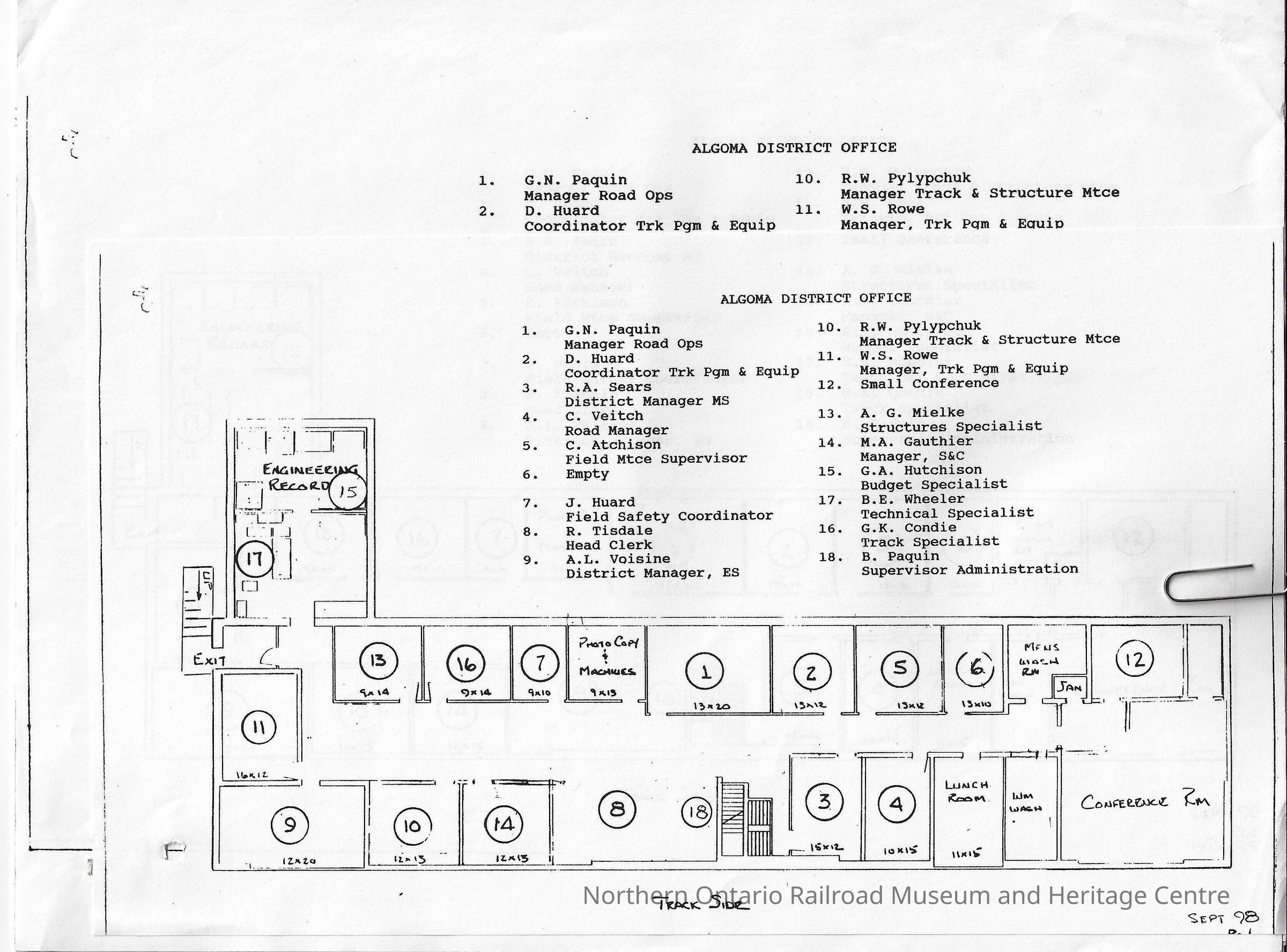 Blueprint and layout of the Algoma District Office of Canadian National. The plan includes a layout and legend for what each of the rooms are. It also lists the names of the workers.Context
