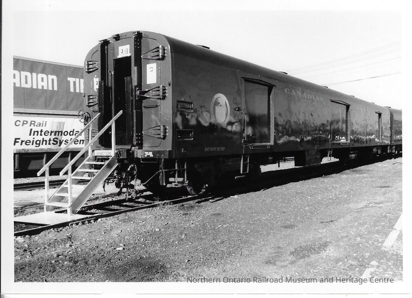 Black and white photograph showing a Canadian Pacific branded Baggage/Display Car in Sudbury ON circa 1970.Photograph Details