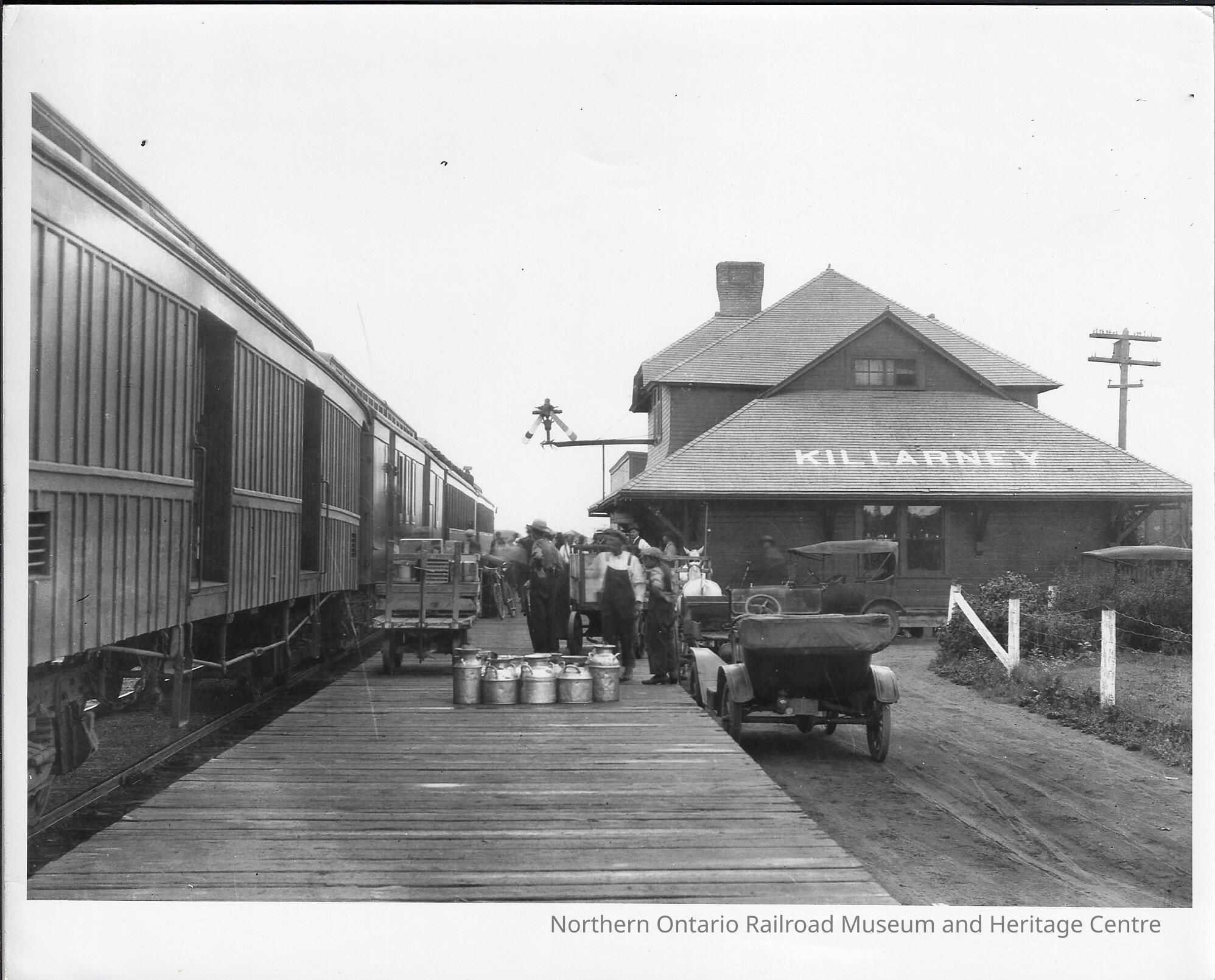 Black and white photograph showing what appears to be either a freight or a mixed train at the Killarney (Manitoba) station circa 1920. The train is on the left side of the photo, and the station building is to the right. There are multiple people on the platform as well as baggage carts. It is undetermined whether or not the train is being loaded or unloaded. Next to the platform is a dirt road with two automobiles and a horse and cart parked on them. What appears to be milk cars in the foreground makes it likely they are a product of a local dairy farm being shipped out to a major centre