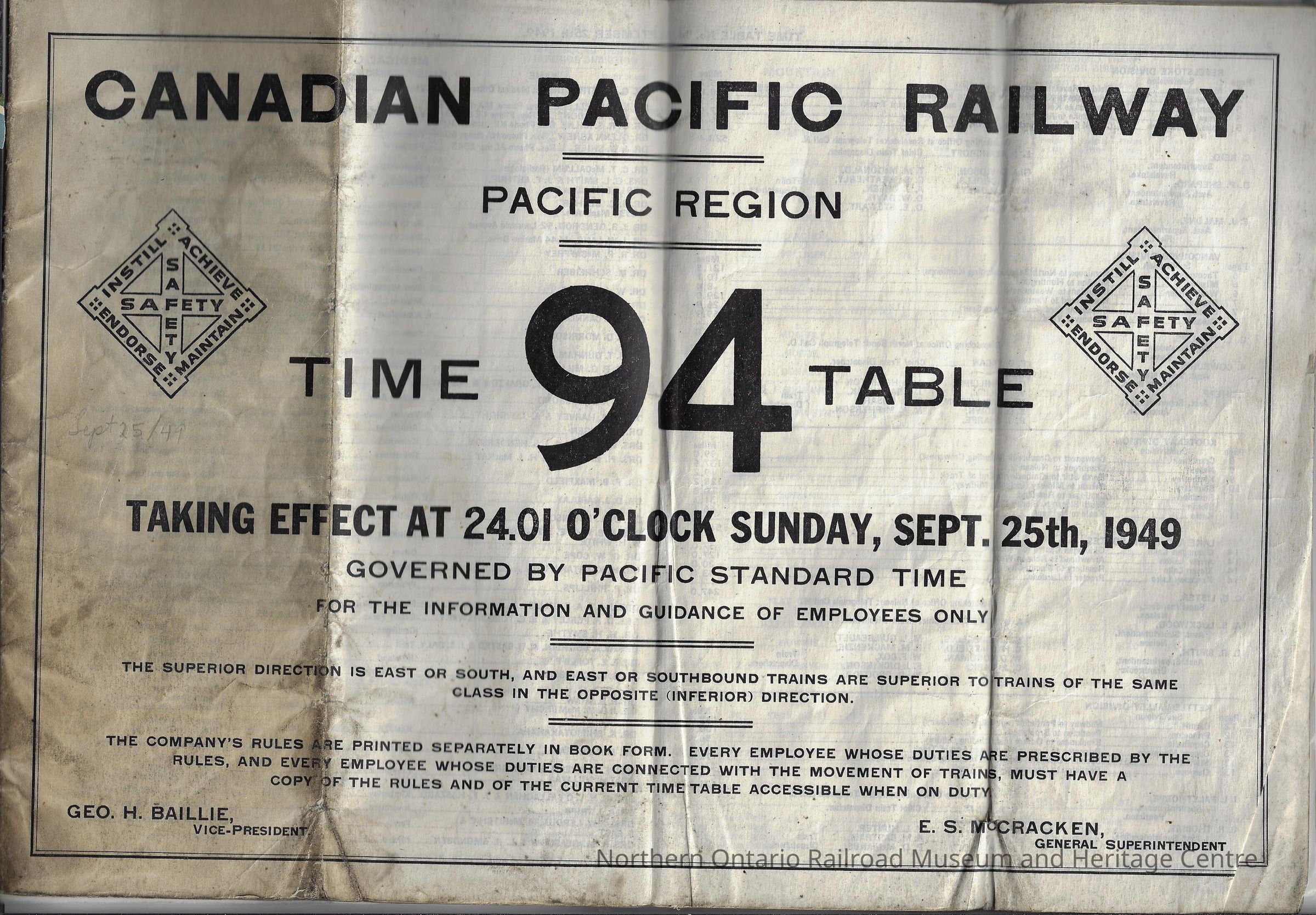 Canadian Pacific Railways branded pacific region timetable #94, dated September 25, 1949Context