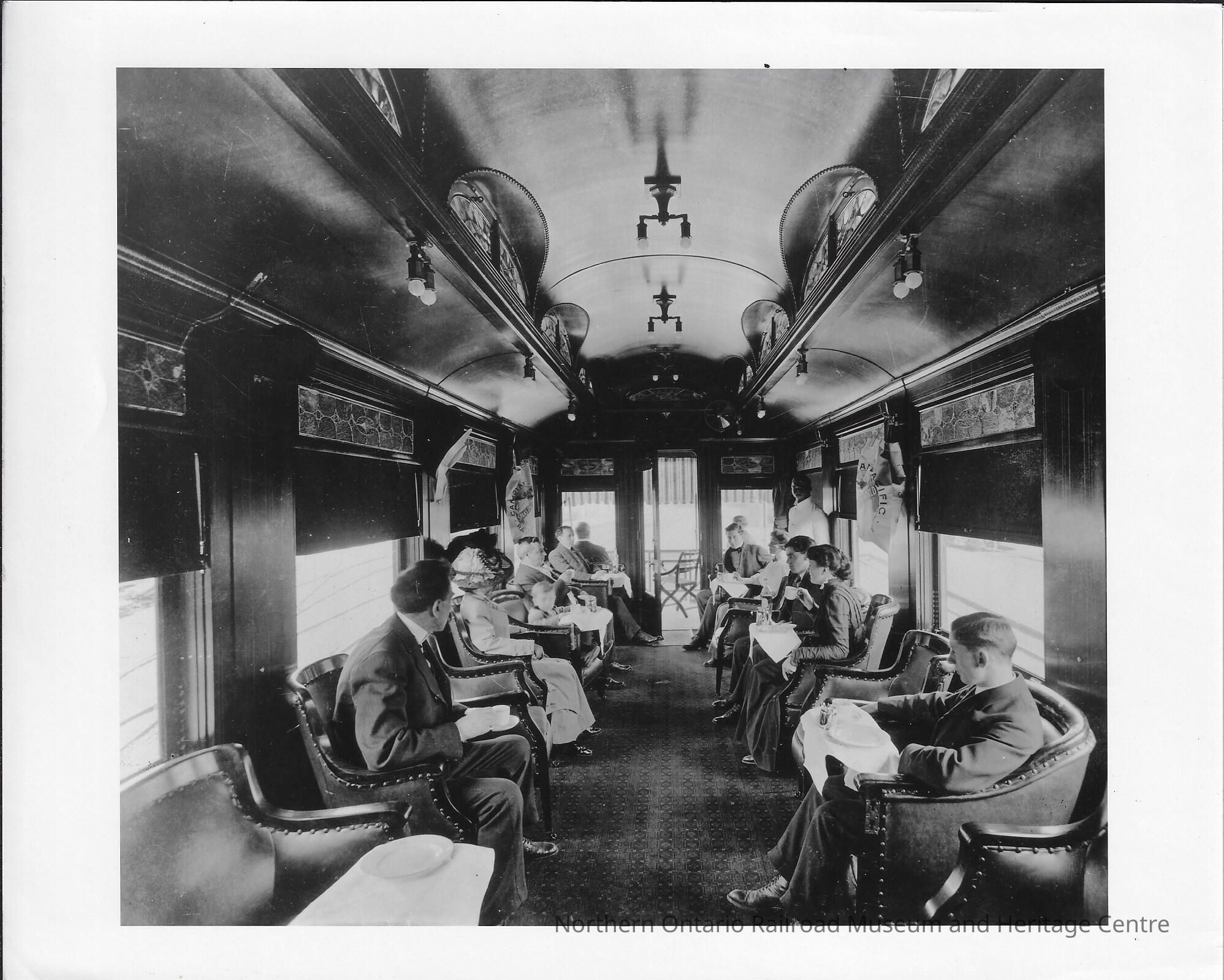 Black and white photograph showing the interior of a Canadian Pacific passenger car circa 1900. The photograph shows approximately 11 passengers sitting on board the passenger car as well as one waiter/porter who is standing. This car would seem to have a combination of sleeping, buffet and observation services.An open observation platform is visible through the rear door of the car. Some of the passengers are eating and have small trays on the arms of their chairs to serve as tables. The two women in the photograph appear to be talking to each other. There is also a young boy sitting next to a woman with a large brimmed hat. The rest of the passengers are men.