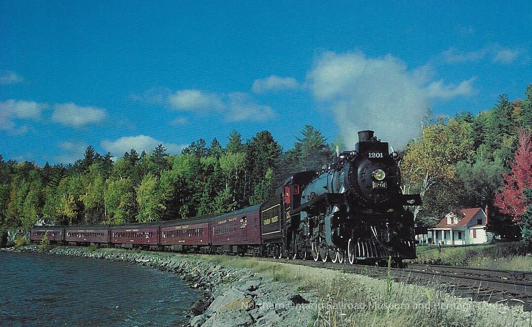 Canadian Pacific postcard showing steam engine # 1201 at Blue Sea, Quebec in 1951. The photo on the front of the postcard shows the front and right side of the engine, tender, and passenger cars it is pulling. The train is coming around a bend.