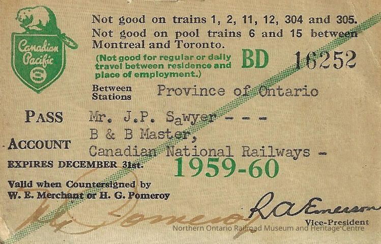 Canadian Pacific: Province of Ontario Pass, Issued to J. P. Sawyer, a Canadian National B & B Master, 1959Entry/Object ID