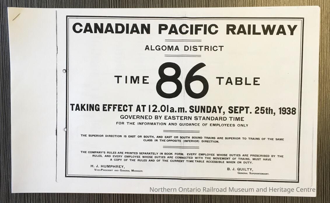 Canadian Pacific Railway, Algoma District, Time table 86, 1938Entry/Object ID