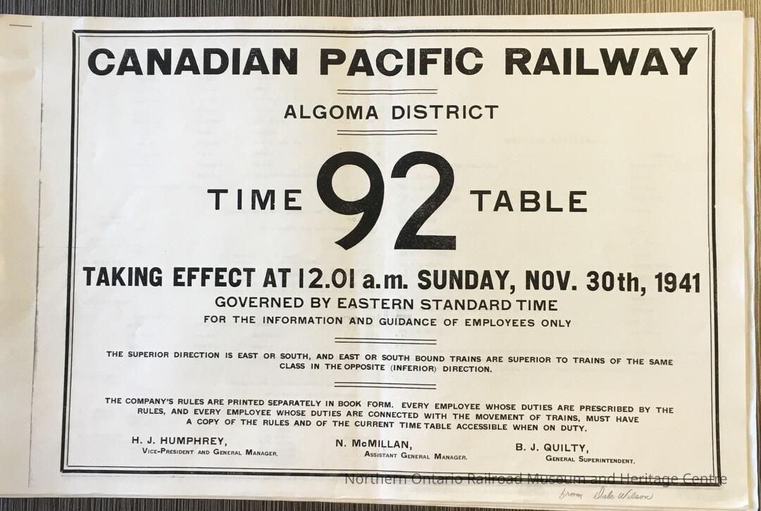 Canadian Pacific Railway, Algoma District Timetable 92, 1941Entry/Object ID