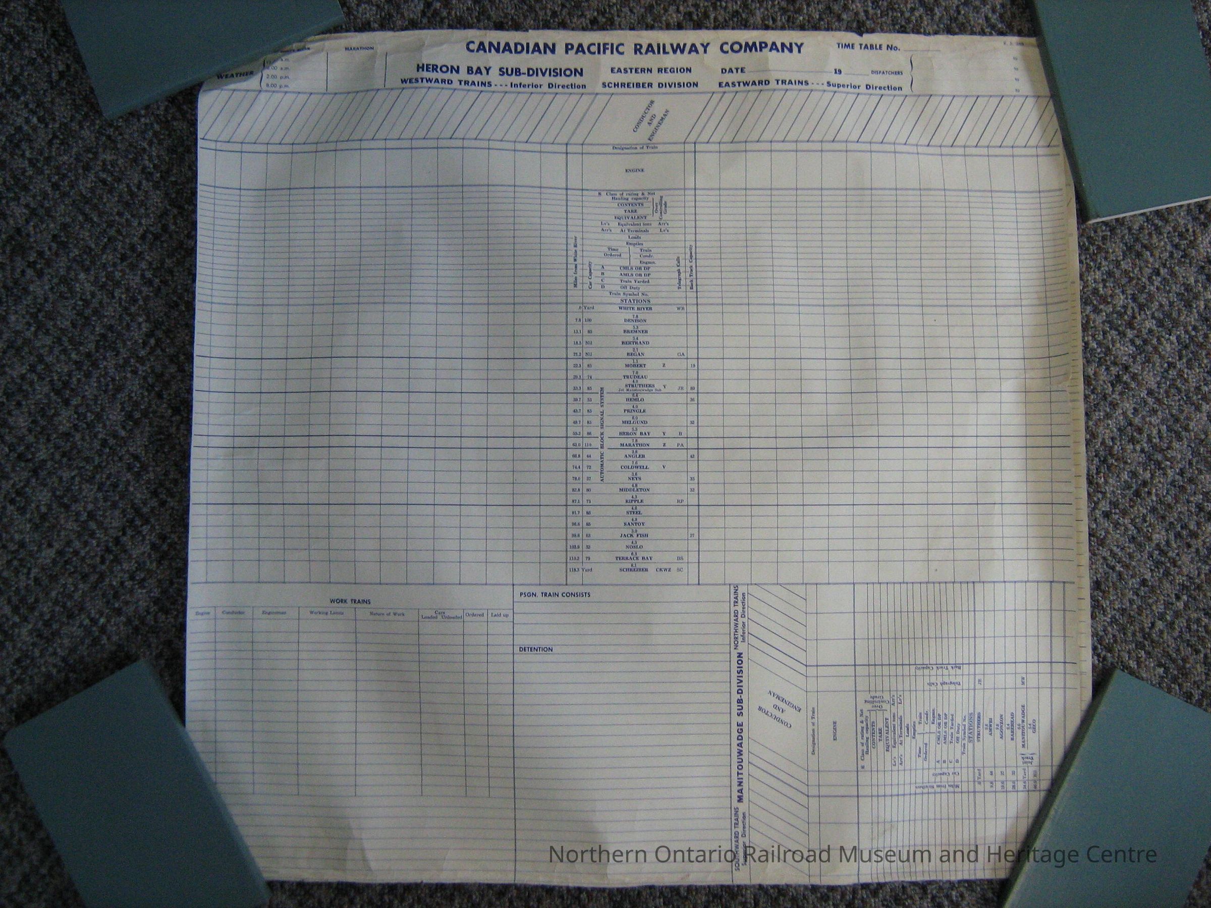 Large Canadian Pacific Railways time table form for Heron Bay Sub-Division, Easter Region. Form has not been filled out. Printed in blue ink on white paper. Printed on both recto and verso.Collection