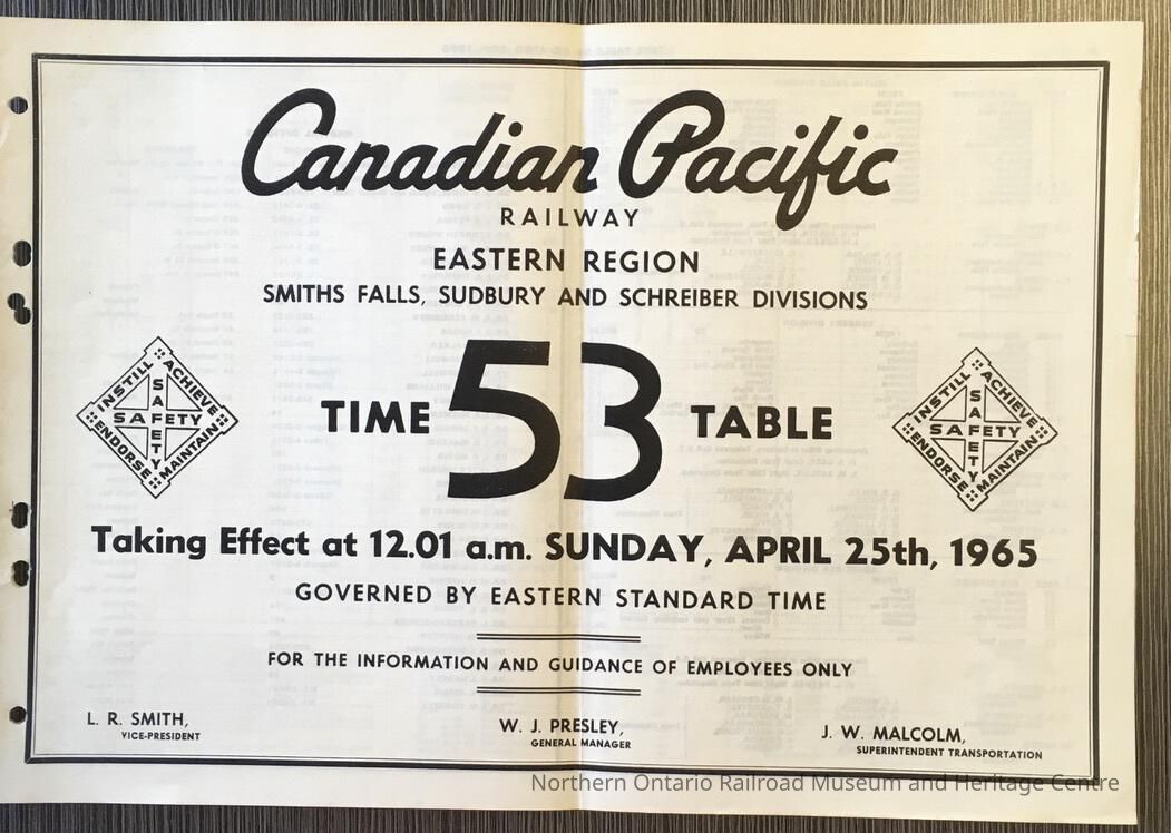 Canadian Pacific Railway, Eastern Region, Smiths Falls, Sudbury and Schreiber Divisions, Timetable 53, 1965Entry/Object ID