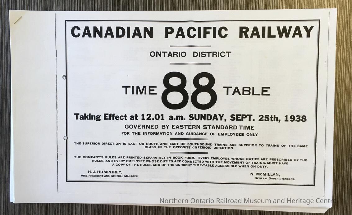 Canadian Pacific Railway, Ontario District Timetable 88, 1938Entry/Object ID