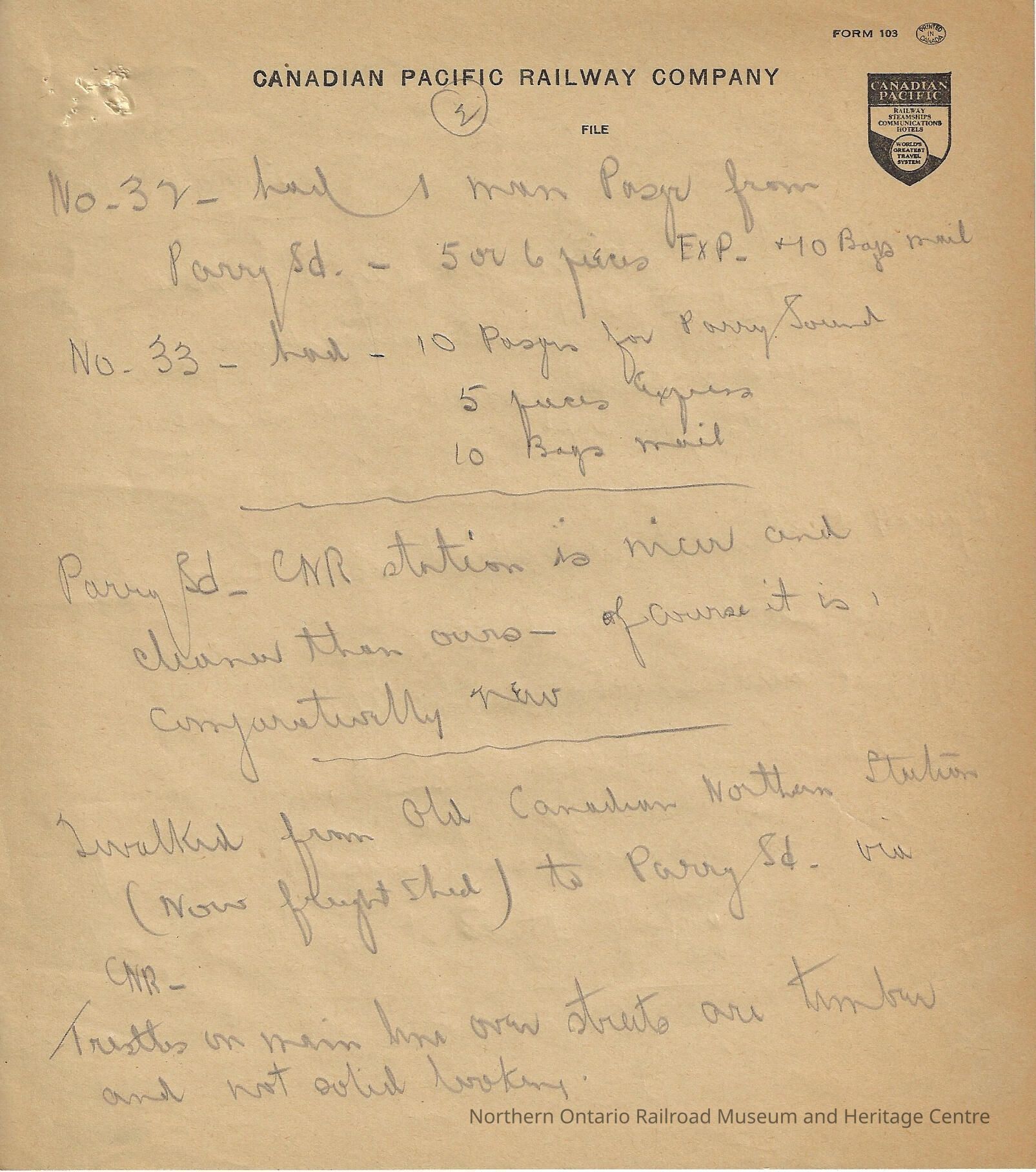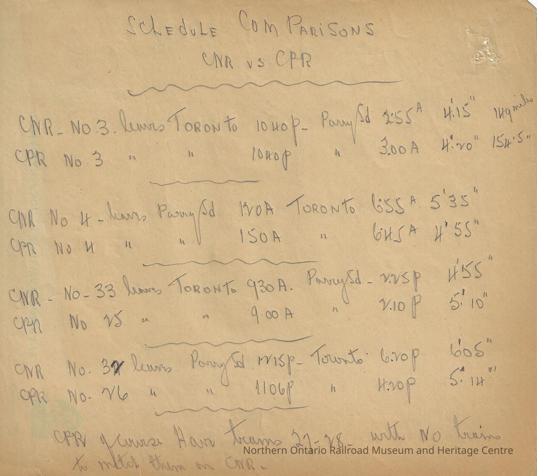 The notes are written on Canadian Pacific letterhead, and are regarding the popularity of their passenger service in comparison to Canadian National's. This includes a comparison of schedule, a copy of what was written on the Canadian National Station's bulletin board in Parry Sound, the number of passengers getting on and off, overall experience, types of cars, and a map of the route.