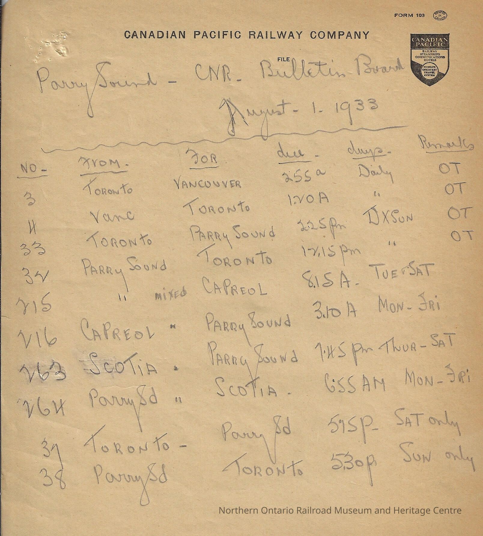 Set of 14 total notes regarding Canadian National's passenger runs specifically through Parry SoundContext