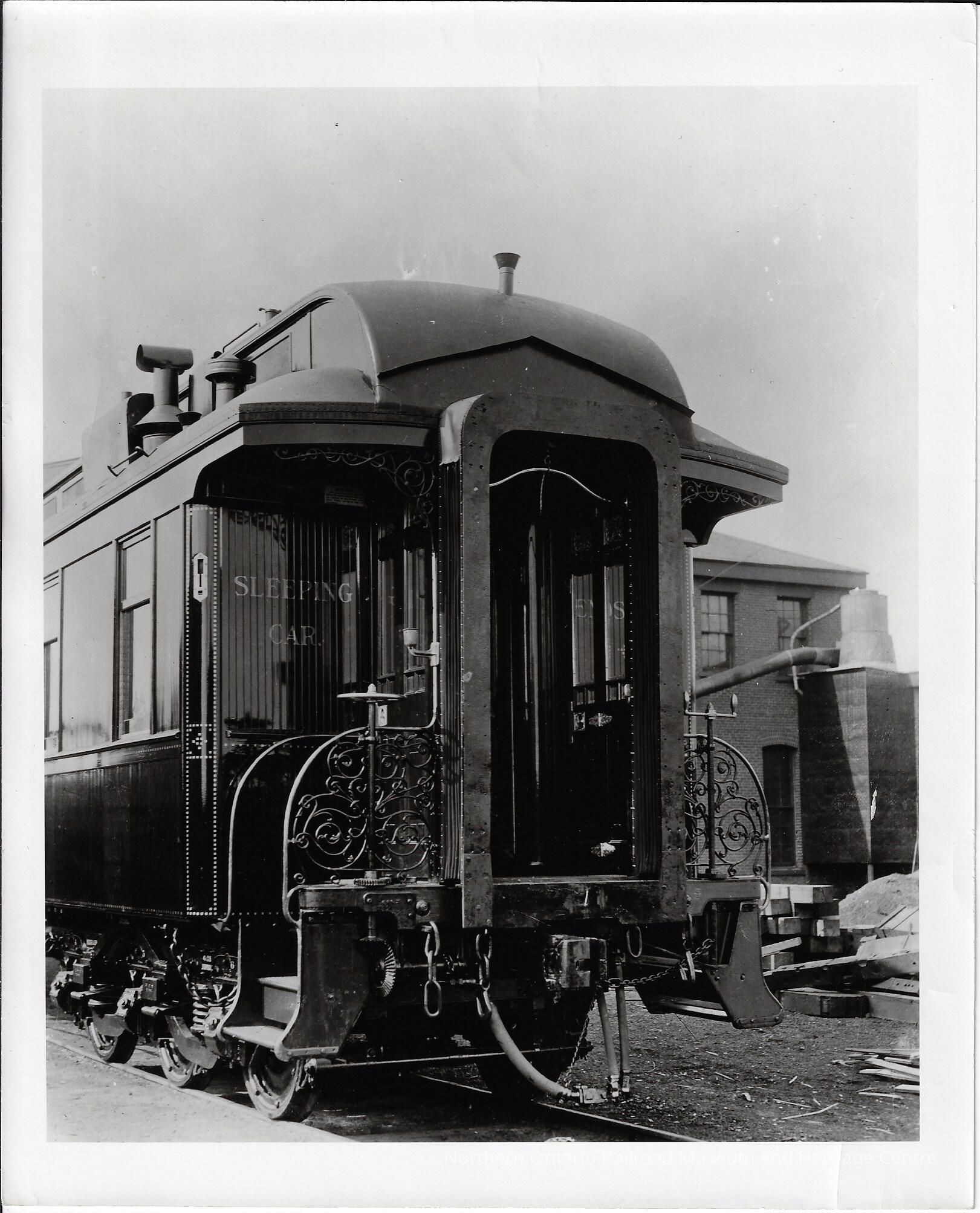 Black and white photograph of a Canadian Pacific branded sleeping car. The photograph shows the back/end of the sleeping car and part of the left side of the car. The rear entrance has decorative railings on either side so that passengers may enter and the words "Sleeping Car" are written on the wall by the steps. There is also part of a building visible in the background.