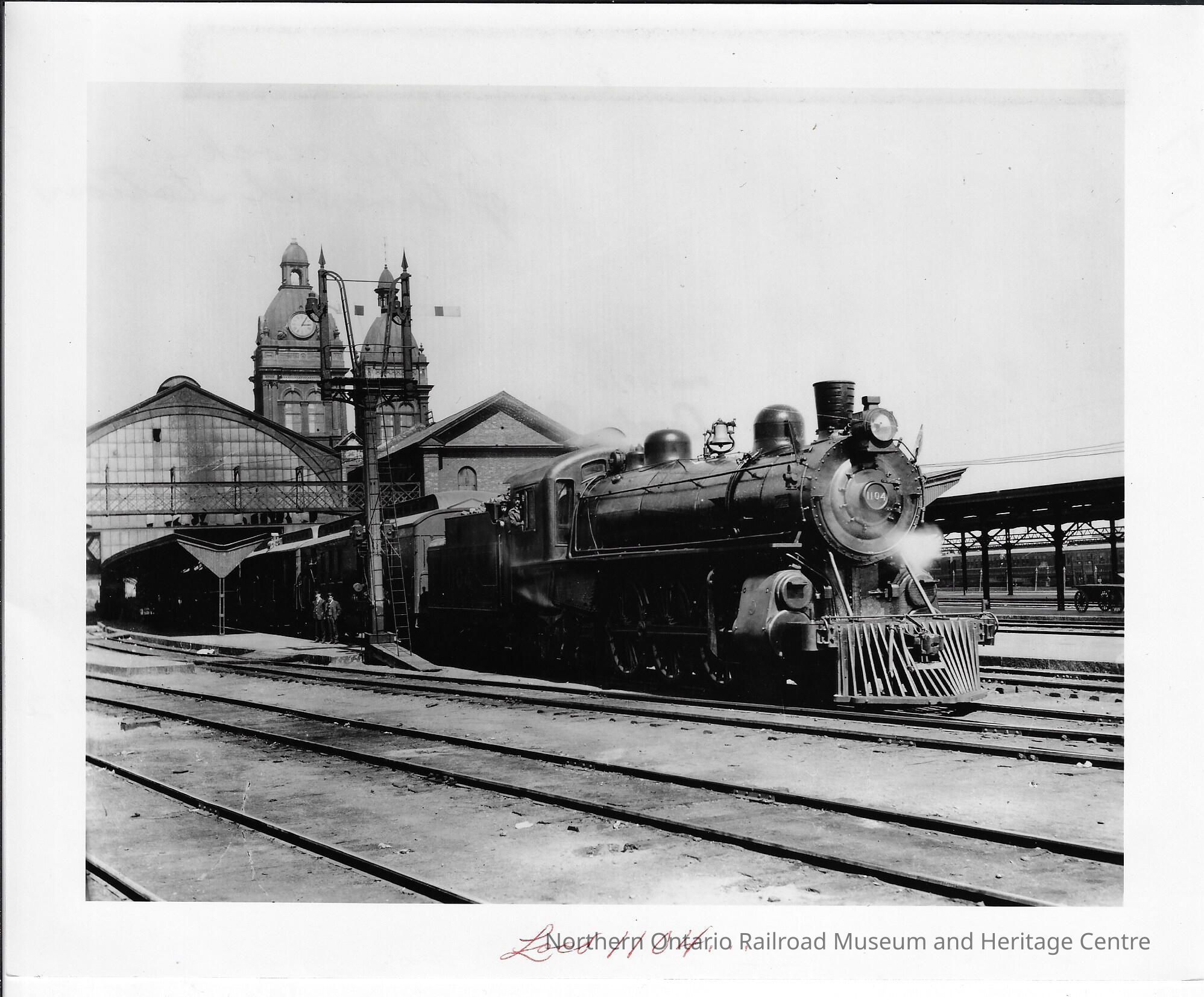 "at 3:05 pm. Passenger train in Old Toronto Union Station Engine is No. 1104 class GL 4-6-2 Type probably taken same time as negative No. 102"Other Names and Numbers