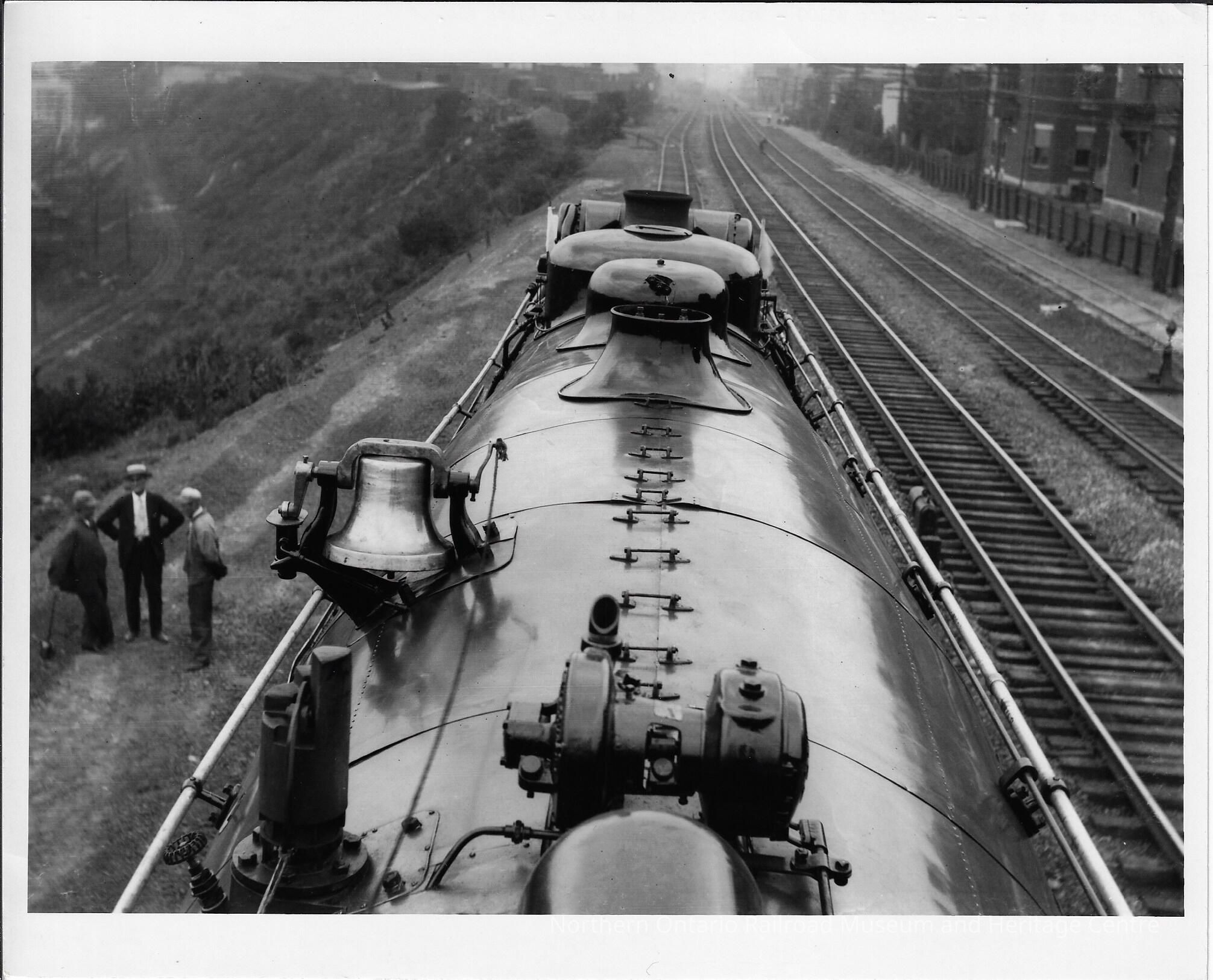 Black and white photograph showing the top of Canadian Pacific steam locomotive engine #3100. The photograph shows the smoke stacks and the bell. To the left, there are three men standing next to each other talking, to the right is more track as well as some buildings.
