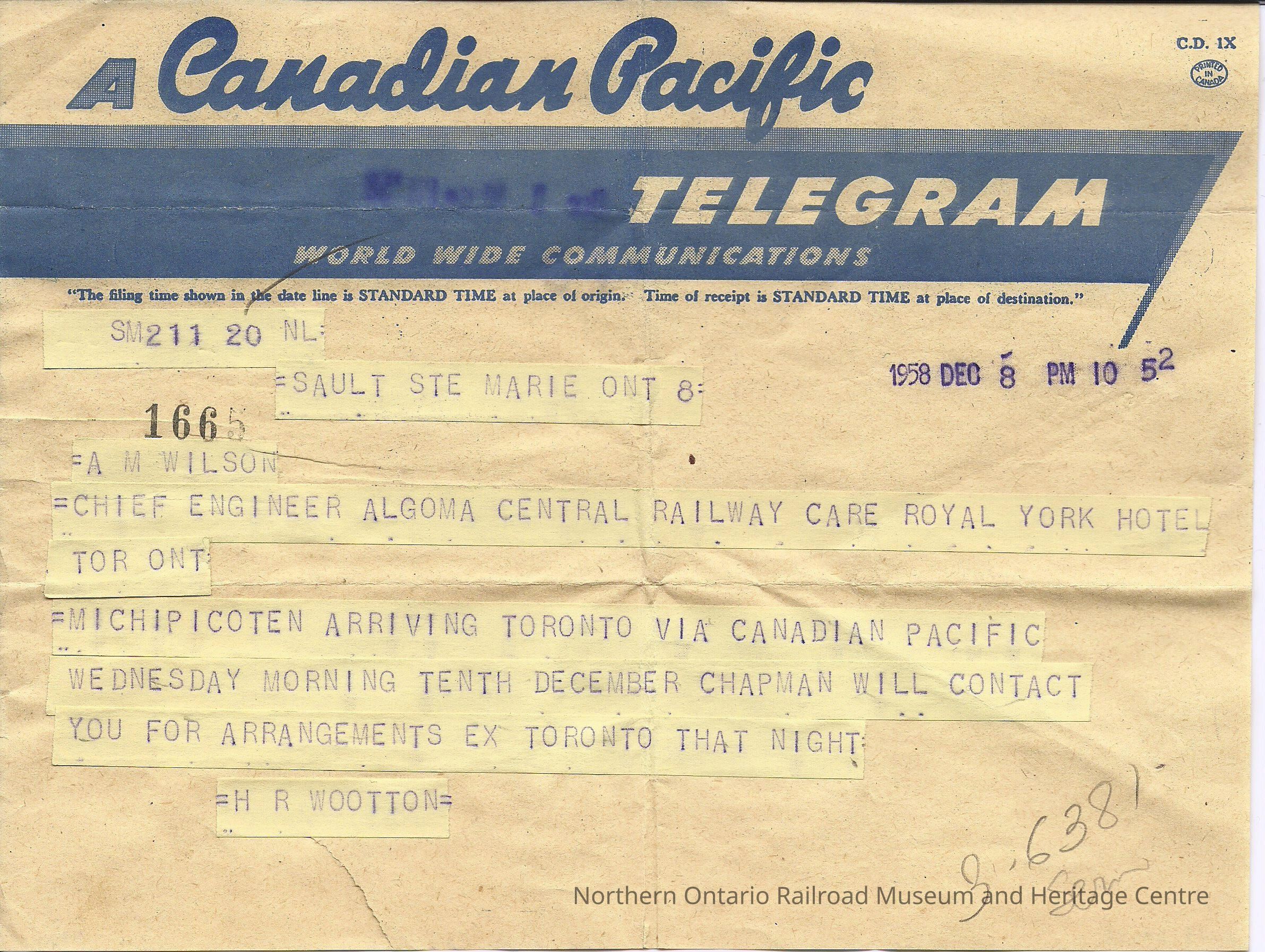 Canadian Pacific Telegram advising A.M. Wilson, Chief Engineer Algoma Central Railway, of Michipicoten's arrival in Toronto via Canadian Pacific Wednesday morning on the 10th of December. Signed H.R. Wootton. Sent December 8, 1958 at 10:52 p.m.Collection