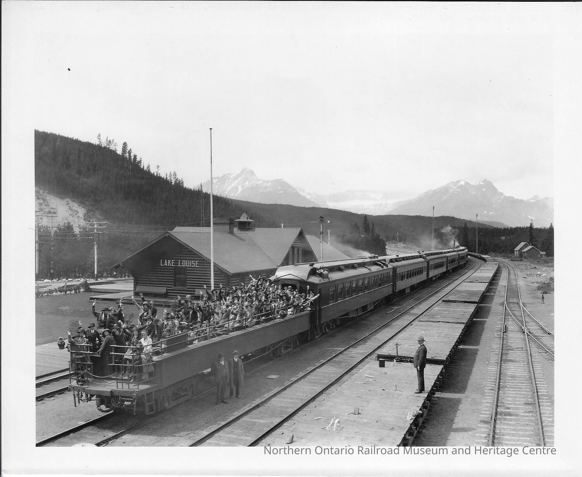 Canadian Pacific Westbound Transcontinental Train at Lake Louise, Alberta with Observation Cars filled with Girl GuidesEntry/Object ID