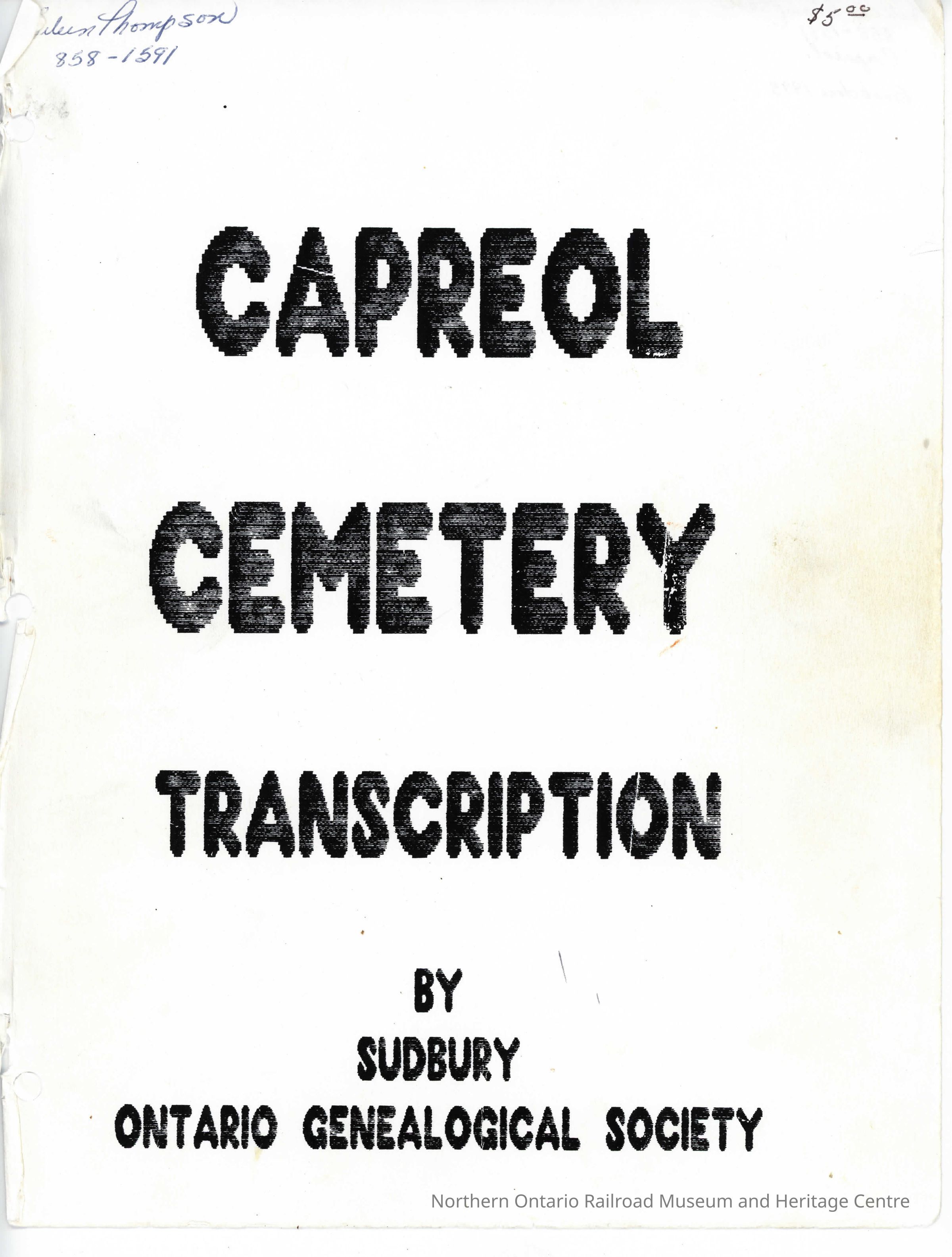 Capreol Cemetery Transcription (1993) By The Sudbury Genealogical AssociationEntry/Object ID