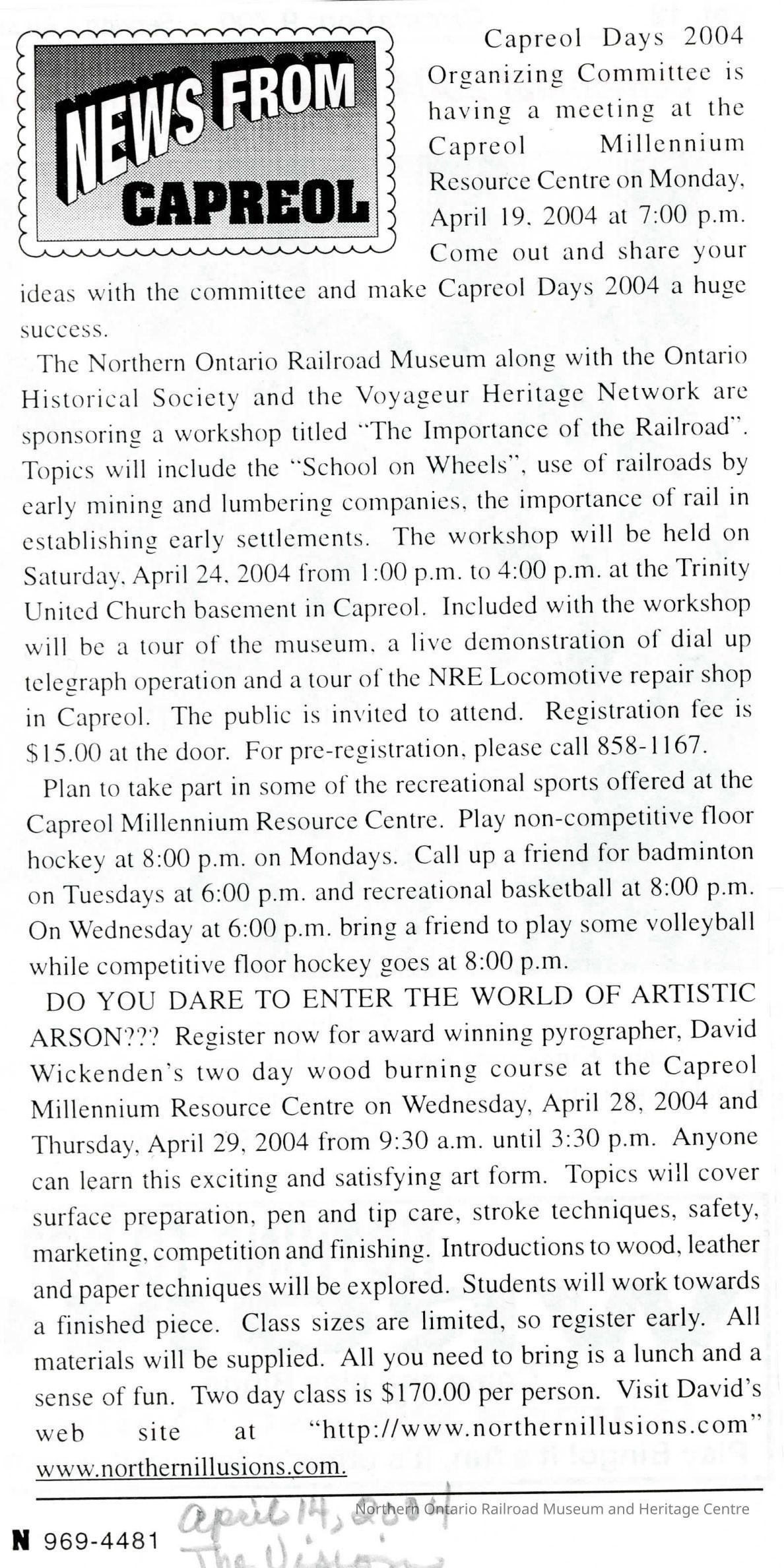 "Capreol Days 2004" News from Capreol, outlines activities and NORMHC Voyageur Heritage Workshop course offeringsCollection