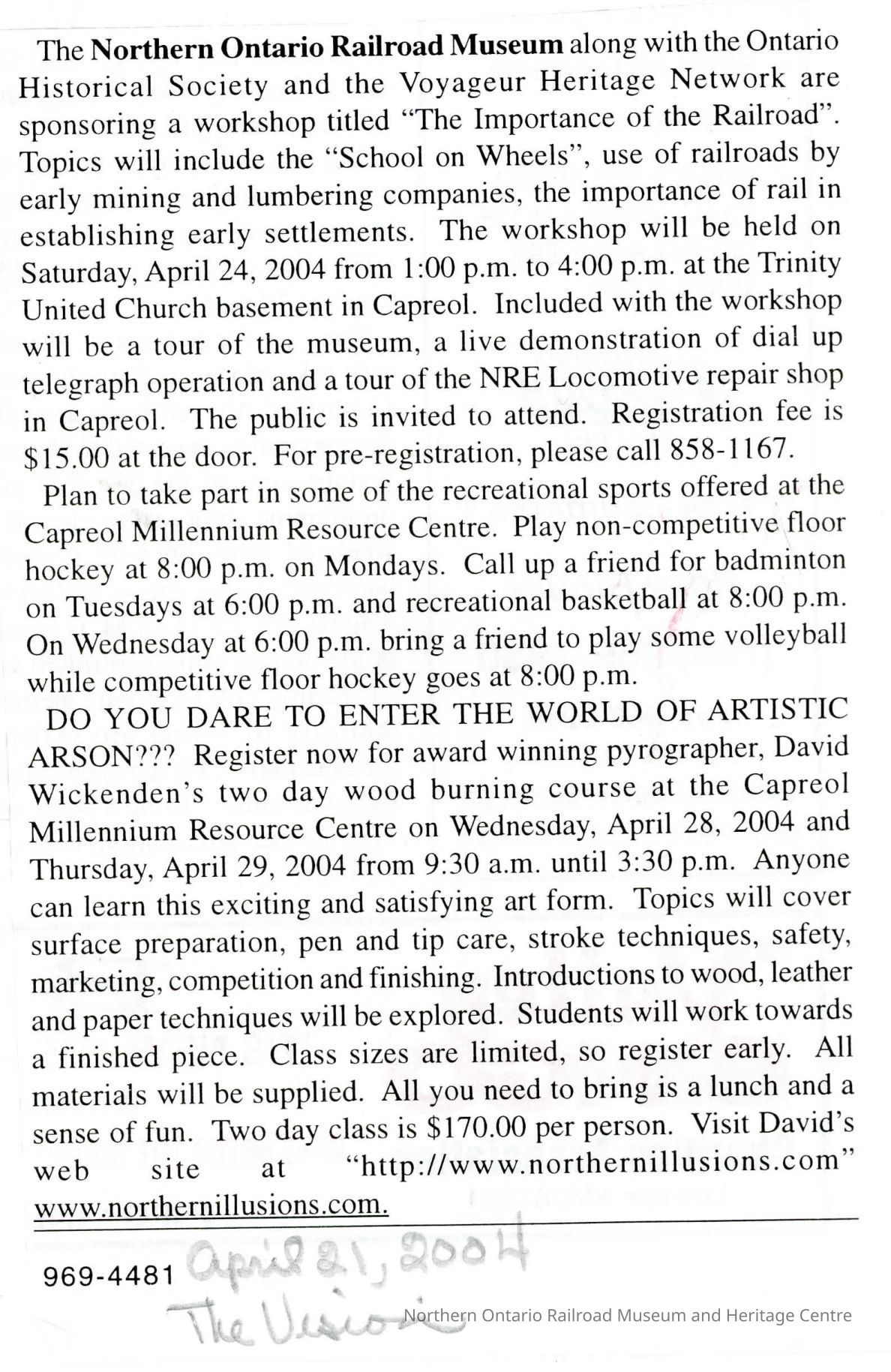 "Capreol Days 2004" News from Capreol, outlines activities and NORMHC Voyageur Heritage Workshop course offeringsCollection
