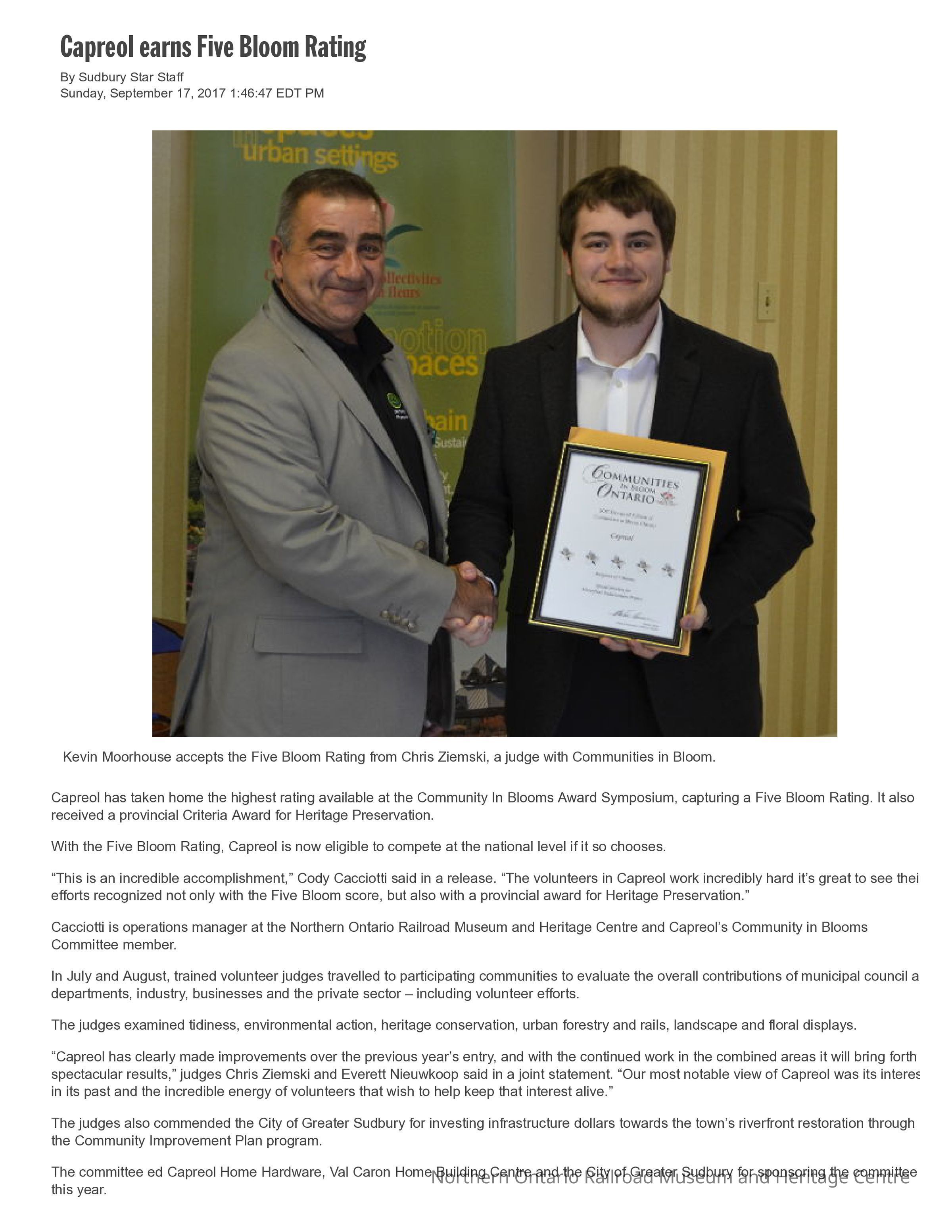 "Capreol earns Five Blooms Rating" on TheSudburyStar.ca, Sunday, September 17, 2017.